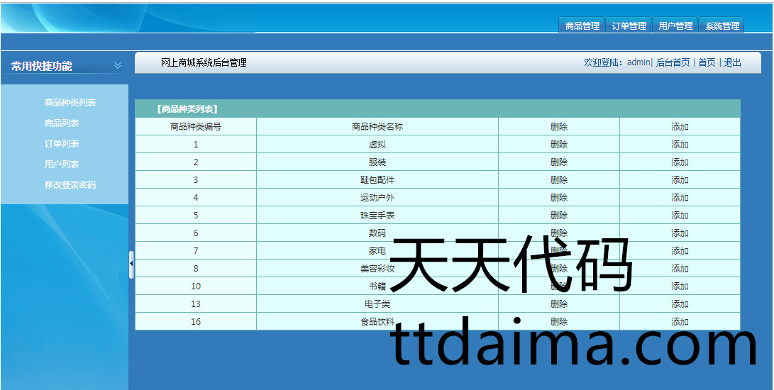 商品分类管理功能:可以查询所有商品分类,添加新的商品分类,删除已有的分类