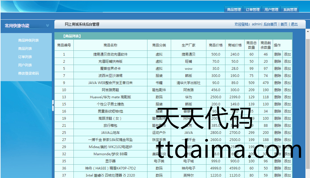 商品管理功能:可以查询所有商品,添加新商品,删除已有商品