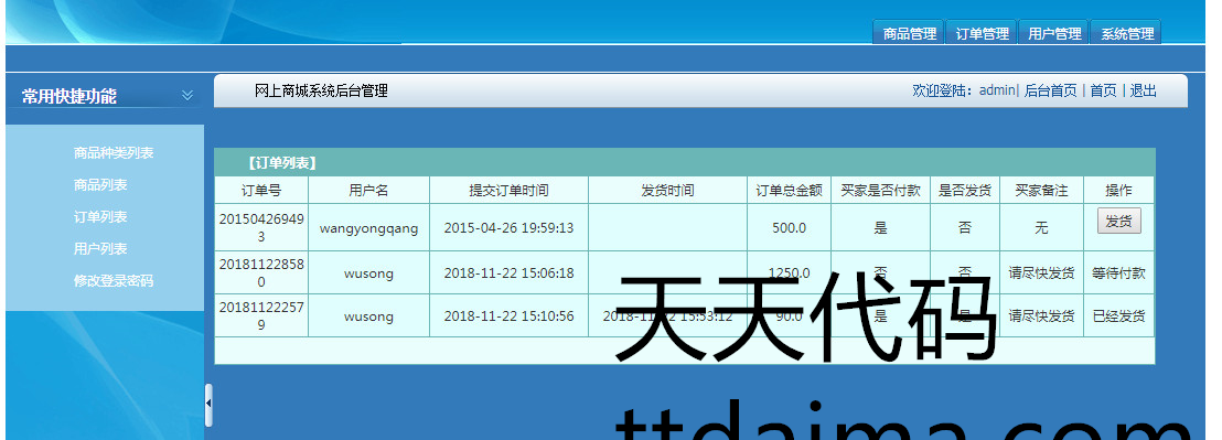订单管理功能:可以查询所有订单,对未发货的订单进行发货处理