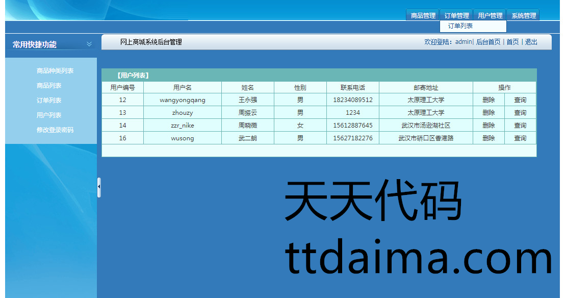 用户管理功能:可以查询所有用户,查询指定用户,删除用户