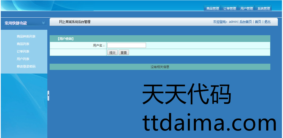 实现了如下功能:商品浏览,在线购买,用户登录注册,购物车,订单,后台管理员登录,商品订单管理,商品种类管理,用户信息管理,等功能。
