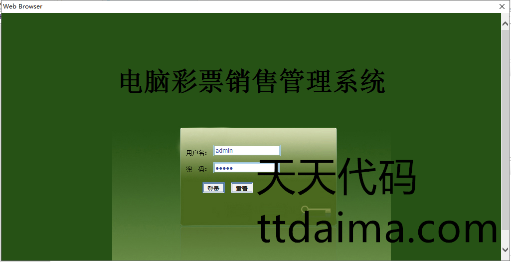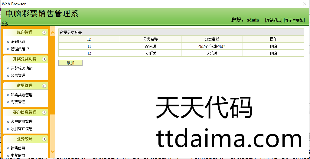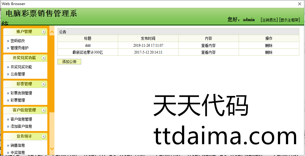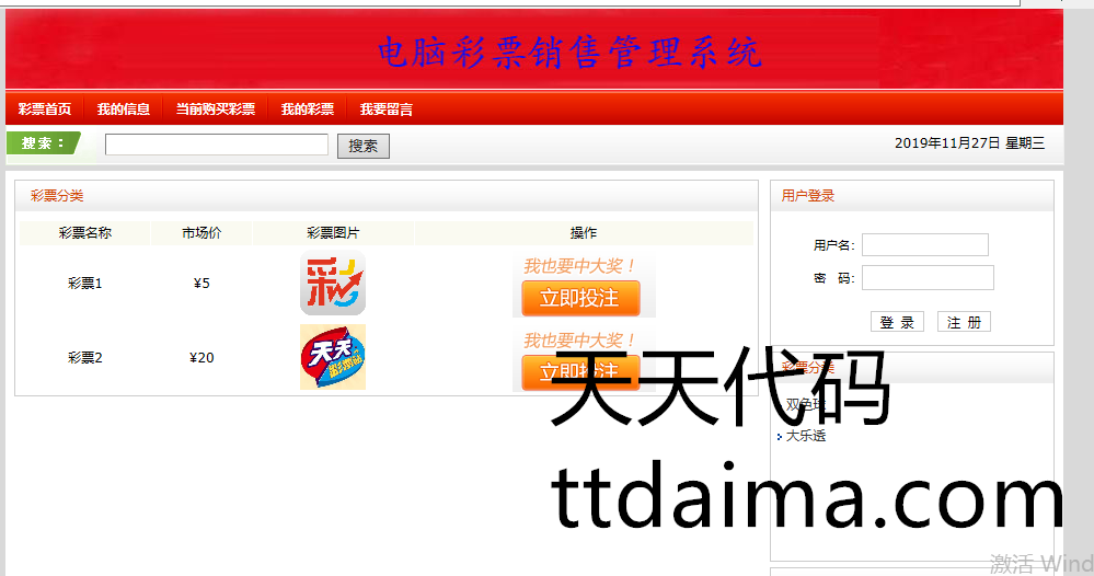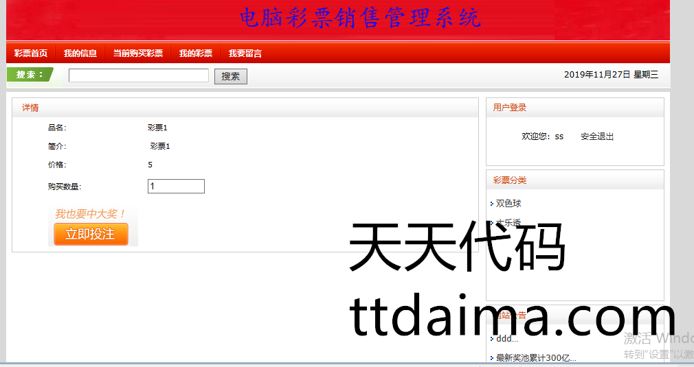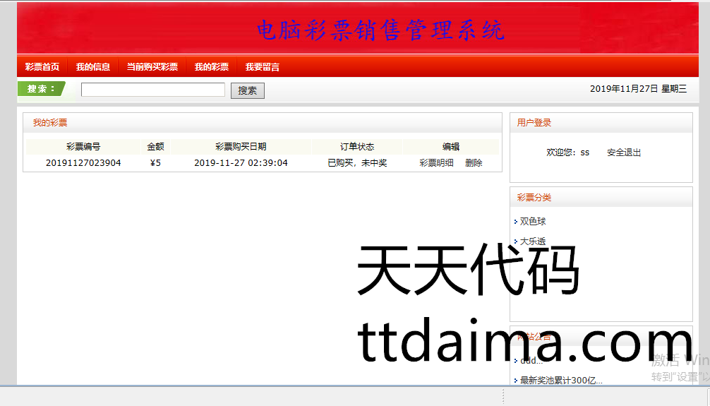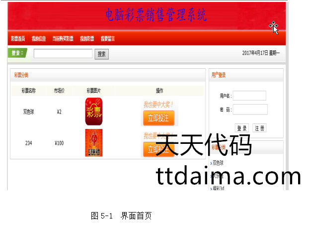 实现了如下功能:前台用户注册、登陆,在线查看彩票信息,在线购买彩票,以及查看已购彩票,进行留言等功能。后台管理员功能主要有,开奖、兑奖功能,彩票类别管理,彩票管理,客户管理,财务统计,销售统计,中奖信息,兑奖信息等功能。