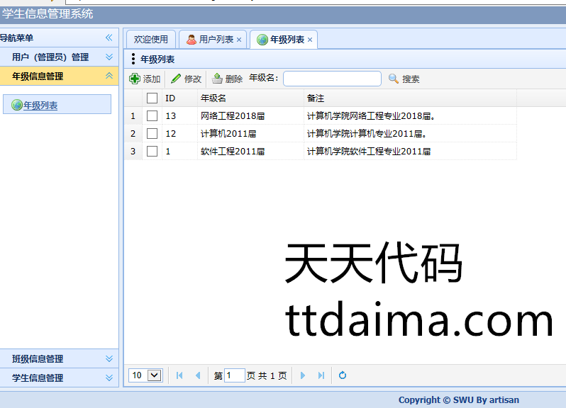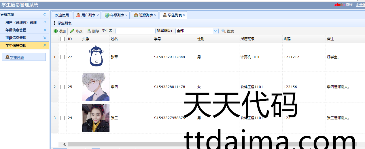 实现了如下功能:管理员可以进行,用户管理,年级信息管理,班级信息管理,学生信息管理,等功能。