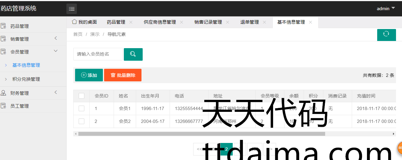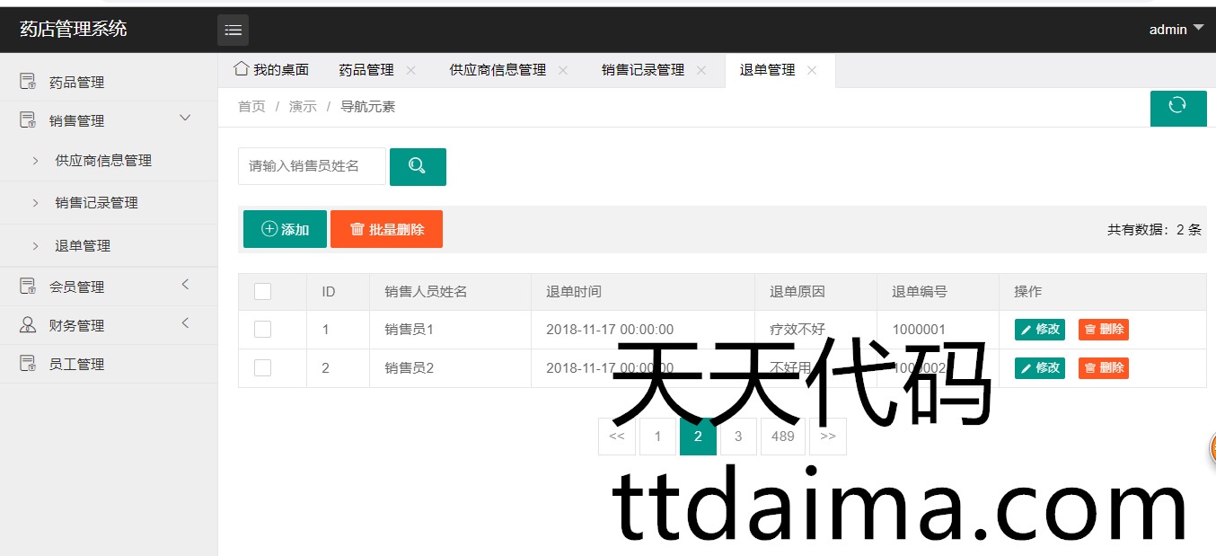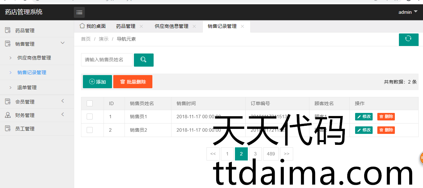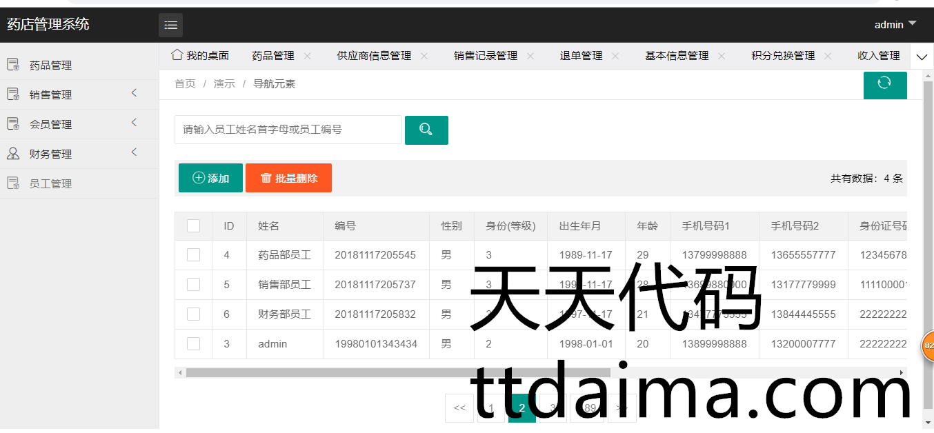 实现了如下功能:药品管理,销售管理,会员管理,财务管理,员工管理,等功能,销售管理中分为供应商管理,销售记录管理,以及退单管理等。该系统具有管理员,老板,部门员工等角色。
