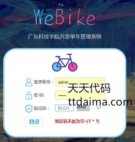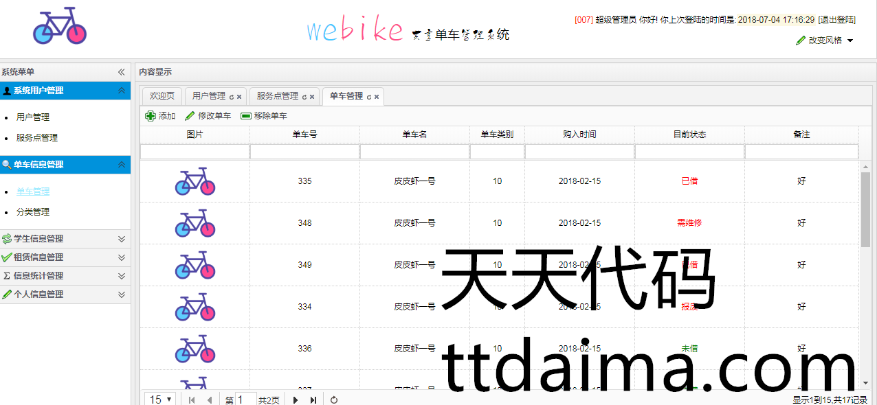 本基于SSM开发高校共享单车管理系统由天天代码收集测试整理。