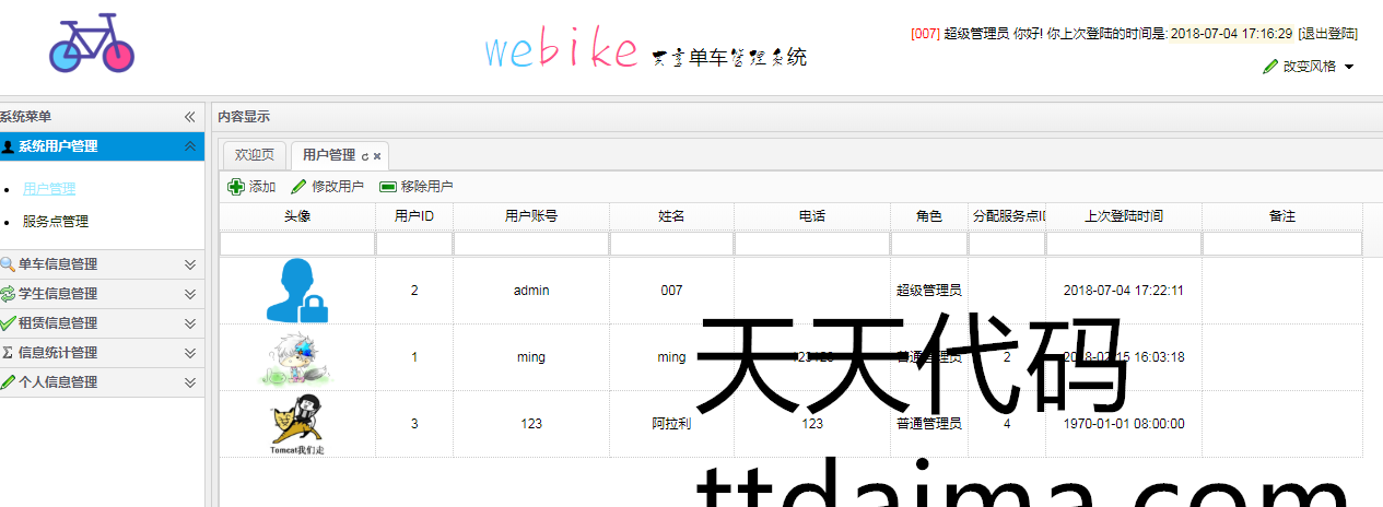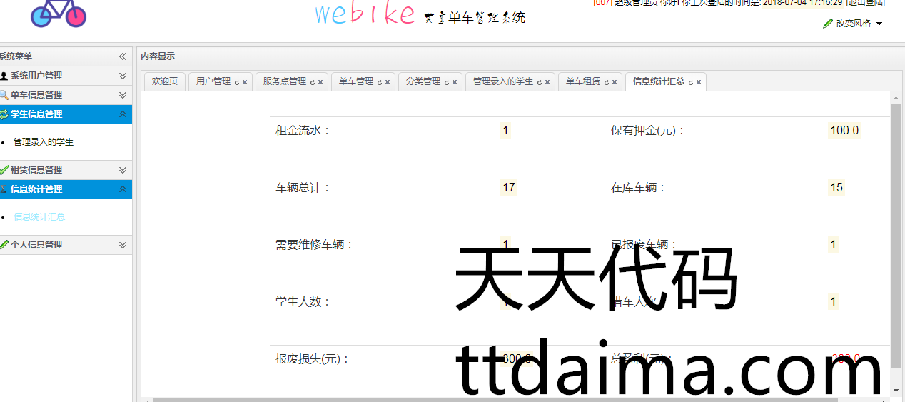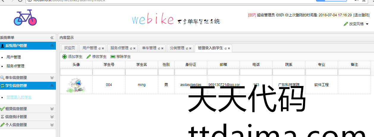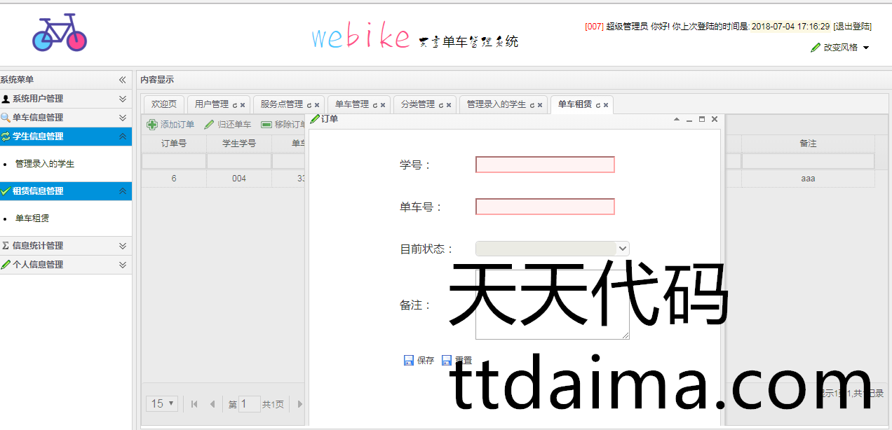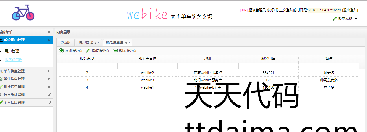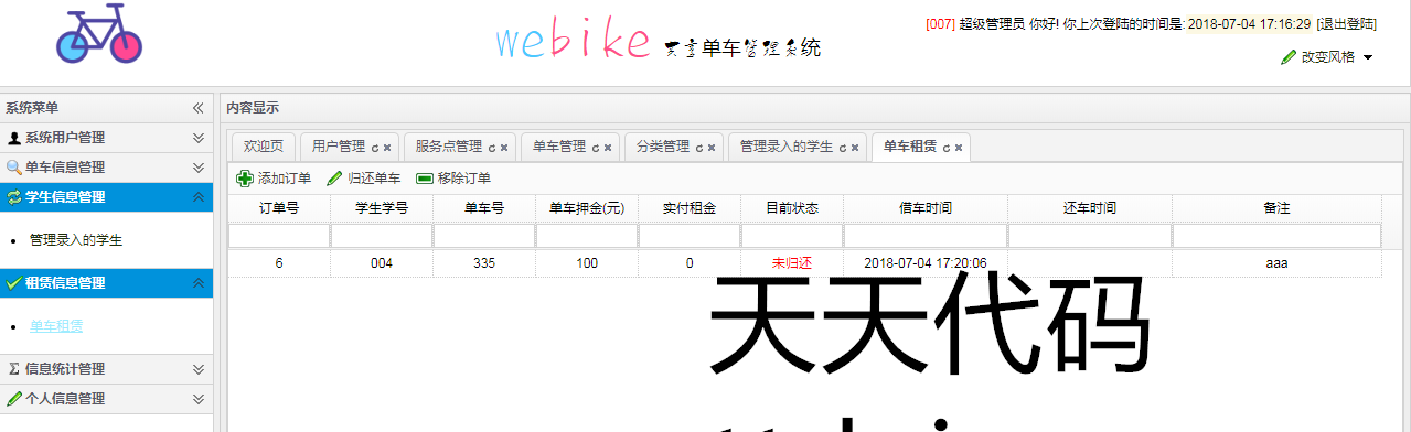 实现了如下功能:管理员登陆之后可以进行,用户管理,服务点管理,单车管理,学生管理,租赁管理,信息统计,等功能。