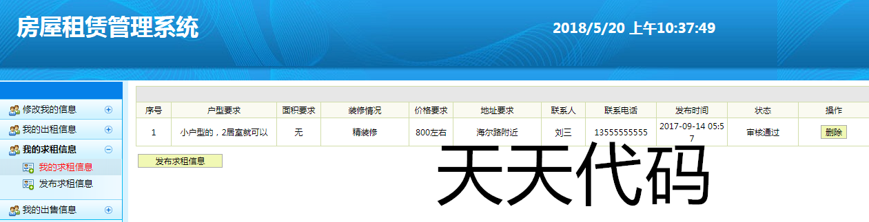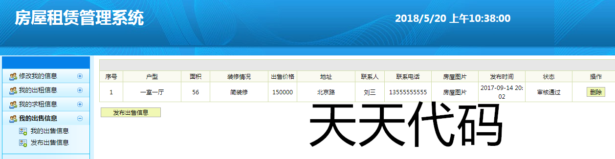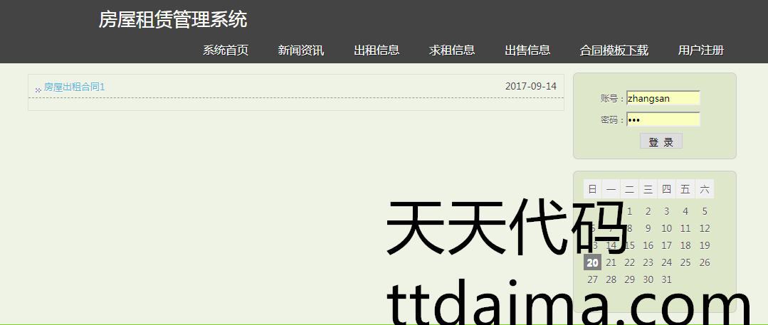 实现了如下功能:用户可以在前台进行注册,登陆,查看网站新闻资讯,发布自己的出租、出售,求租信息,并可以购买、租赁他人的房屋,还可以下载房屋相关的合同模板等功能。管理员后台可以进行,注册用户管理,出租信息管理,出售信息管理,求租信息管理,合同信息管理,网站新闻资讯管理,等功能。