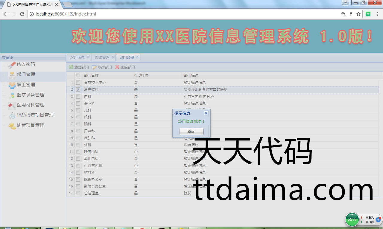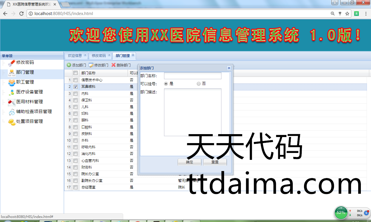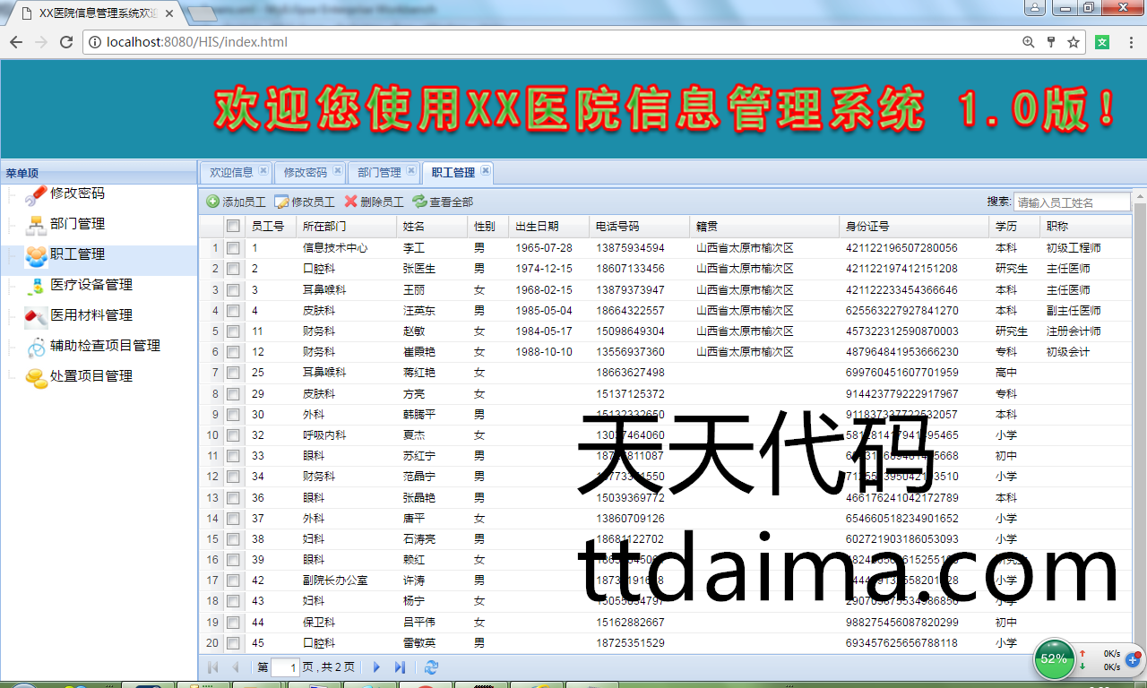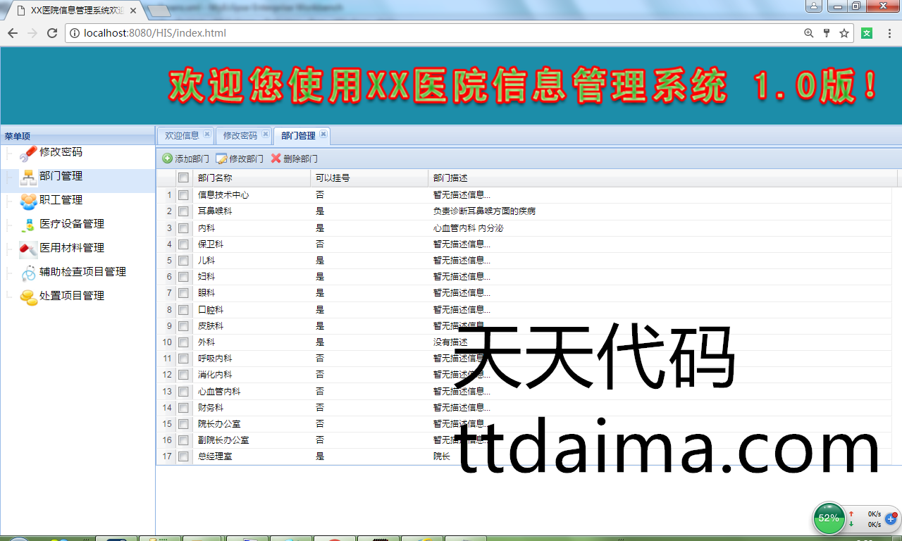 实现了如下功能:该系统管理员可以进行如下管理,部门管理,职工管理,医疗设备管理,医用材料管理,医用检查项目管理,处置项目管理,等功能。