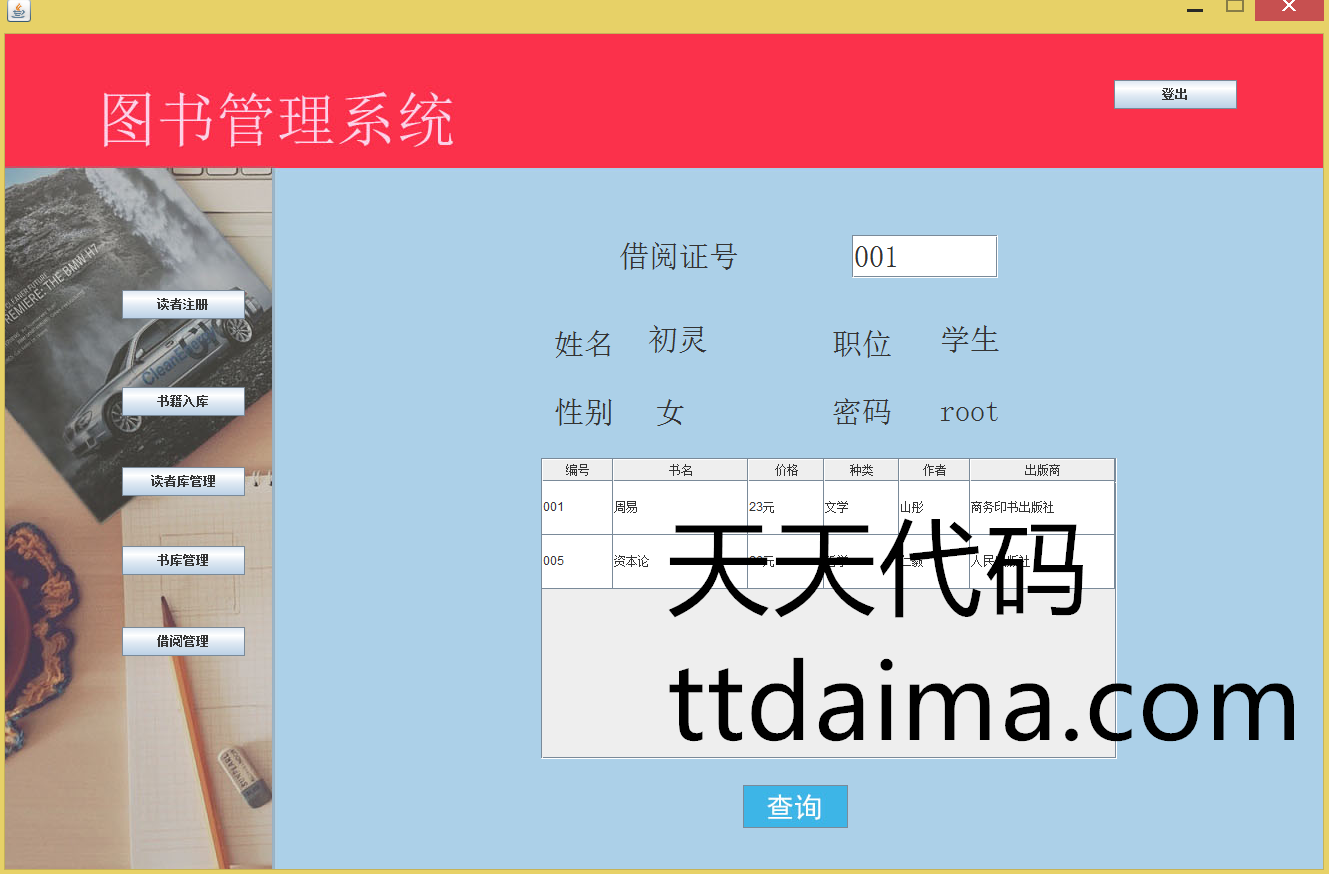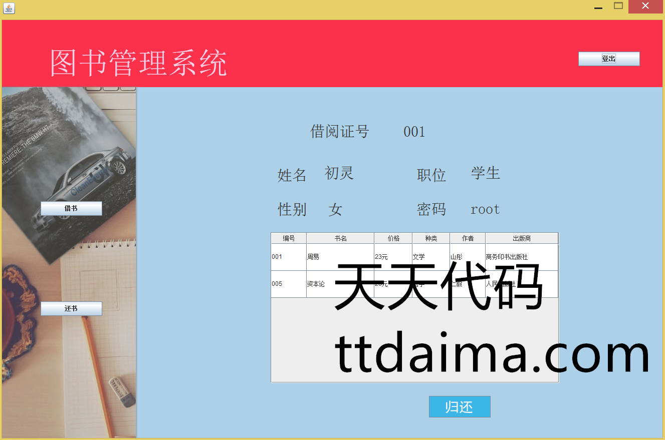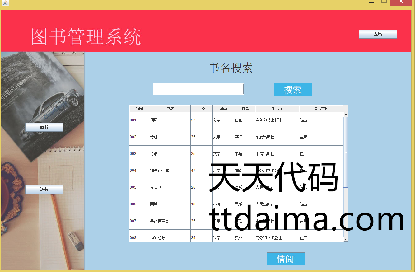 本基于JavaSwing开发图书管理系统(新版本)由天天代码收集测试整理。