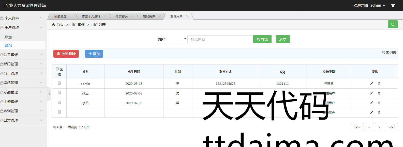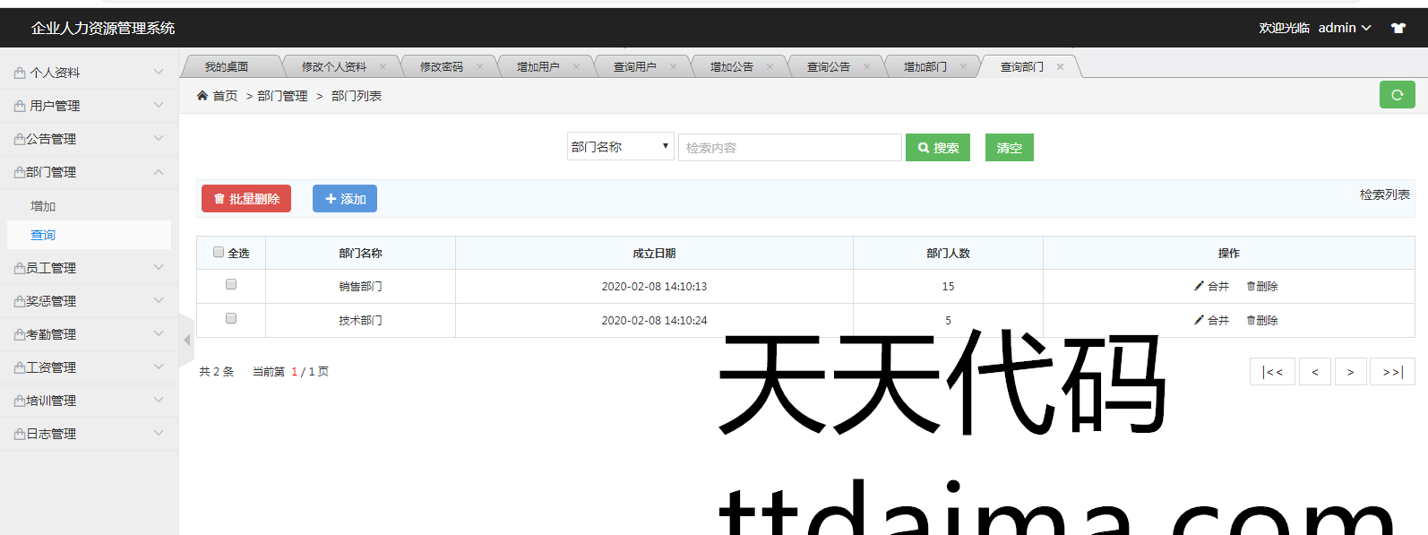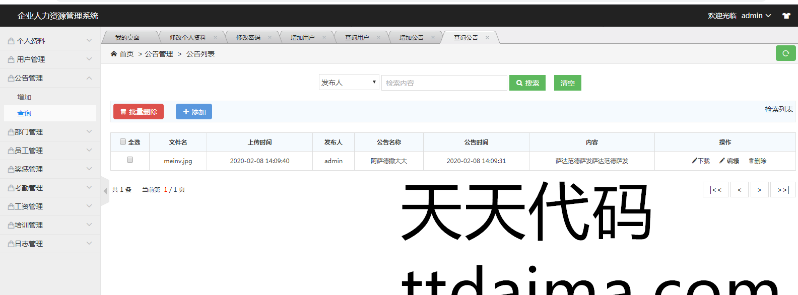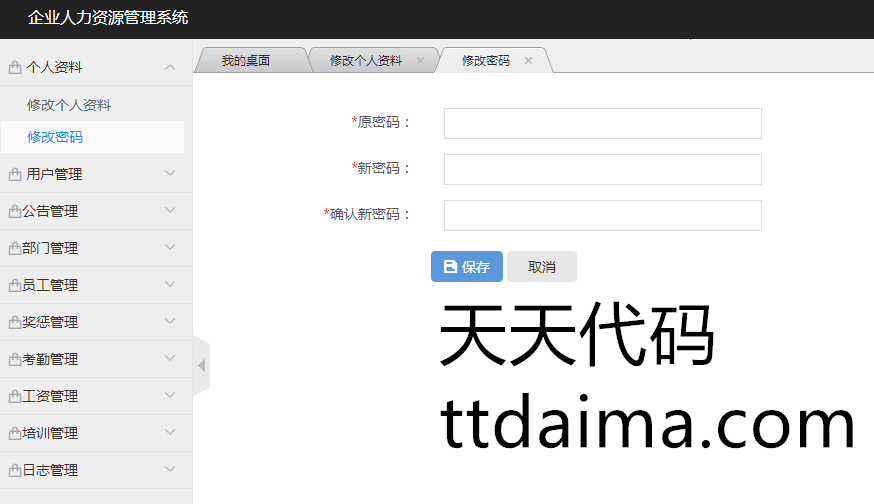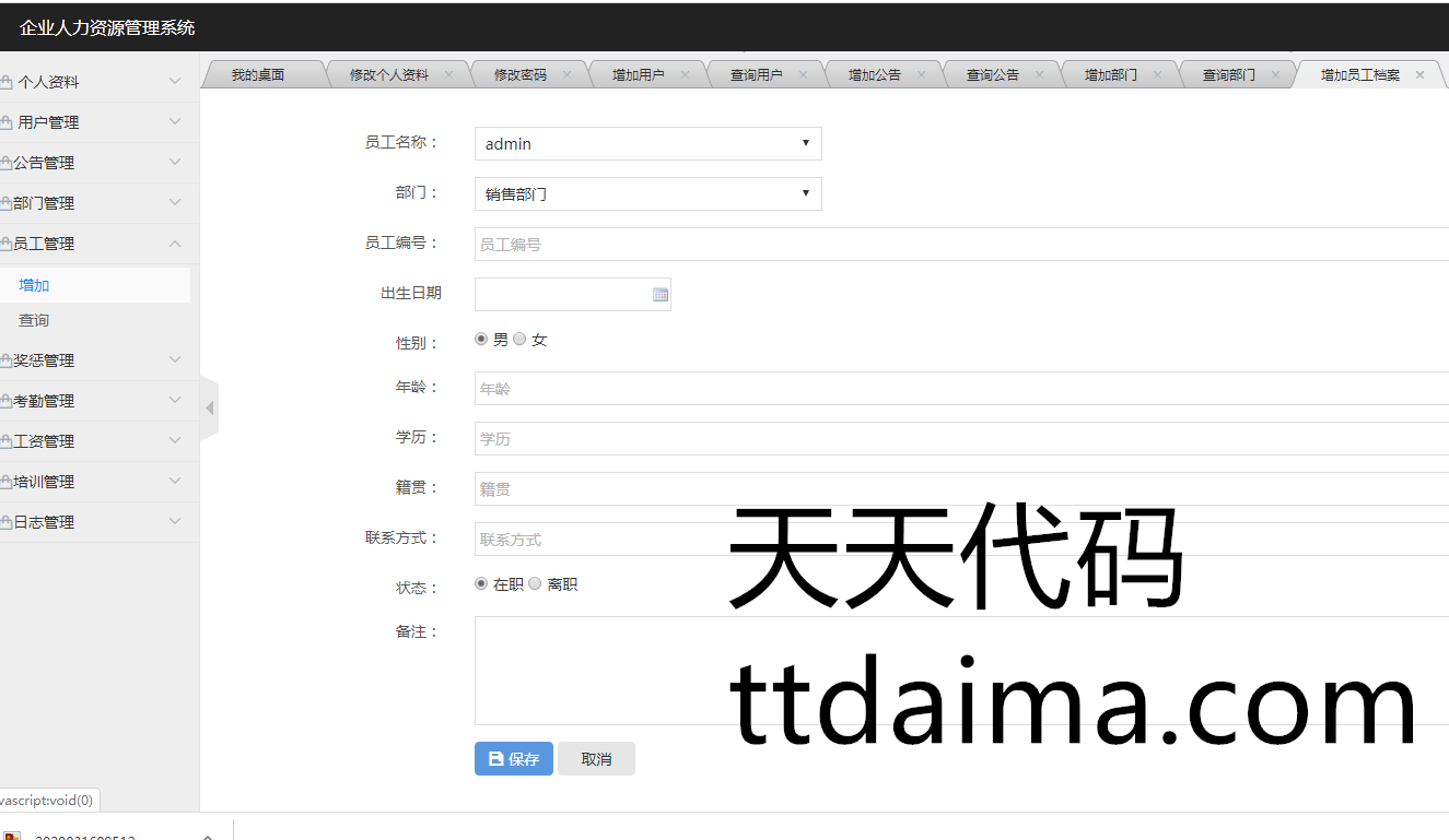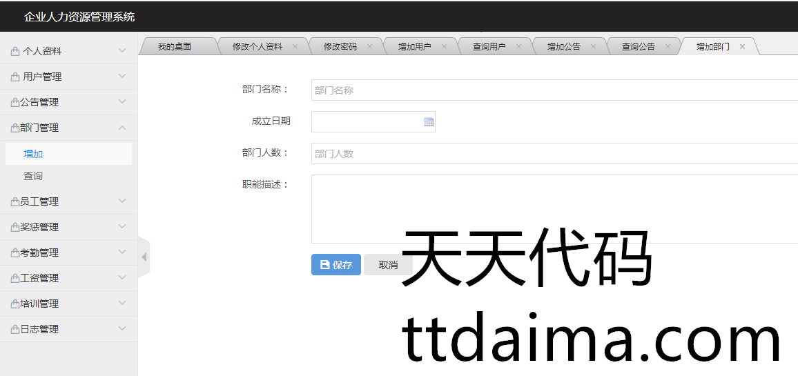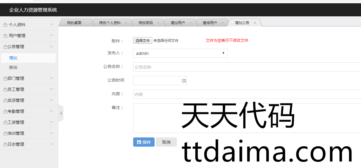 实现了如下功能:用户管理,公告管理,部门管理,员工管理,奖惩管理,考勤管理,工资管理,培训管理,等功能。