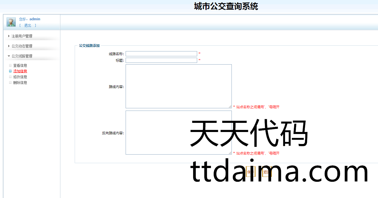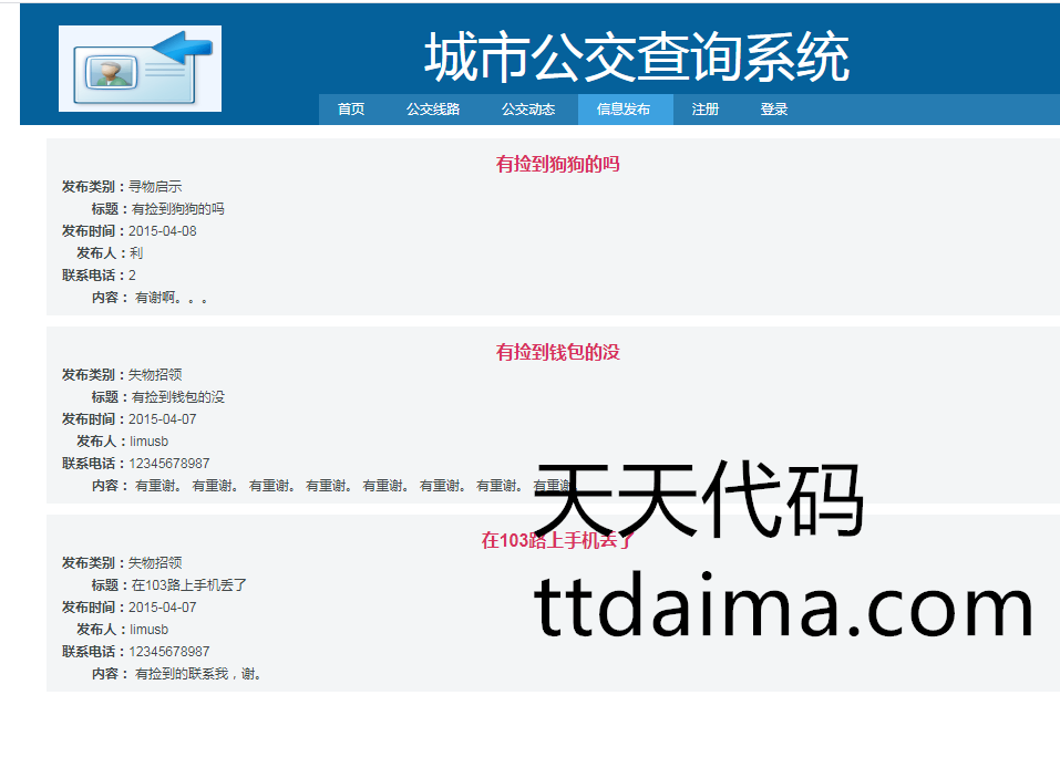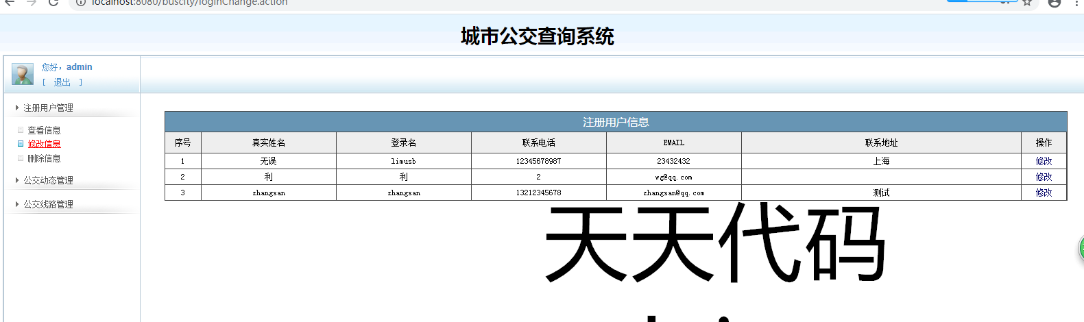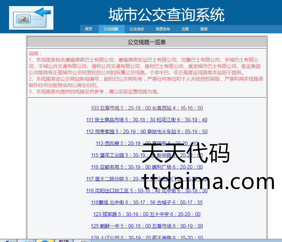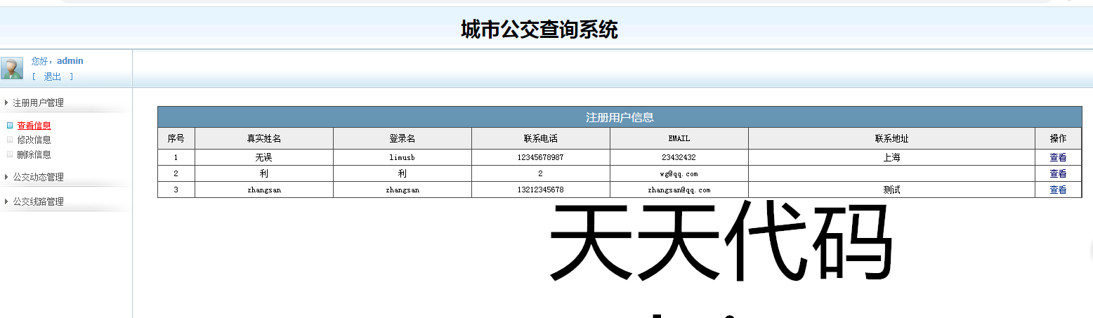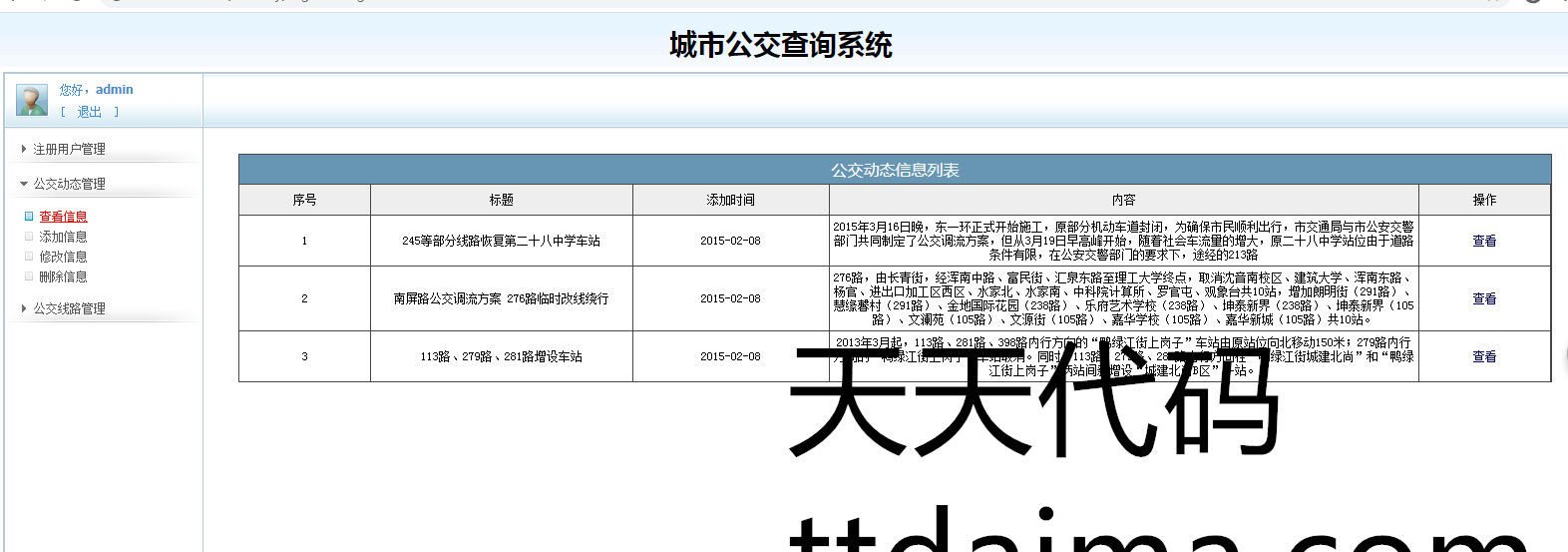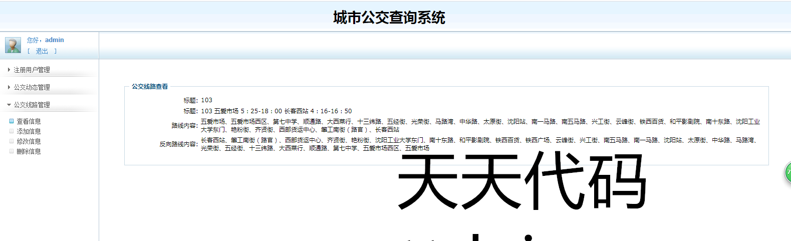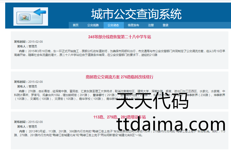 实现了如下功能:用户前台注册,登陆,查看公交线路,查看公交动态,等功能。后台管理员可以进行,注册用户管理,公交动态管理,公交线路管理,等功能。