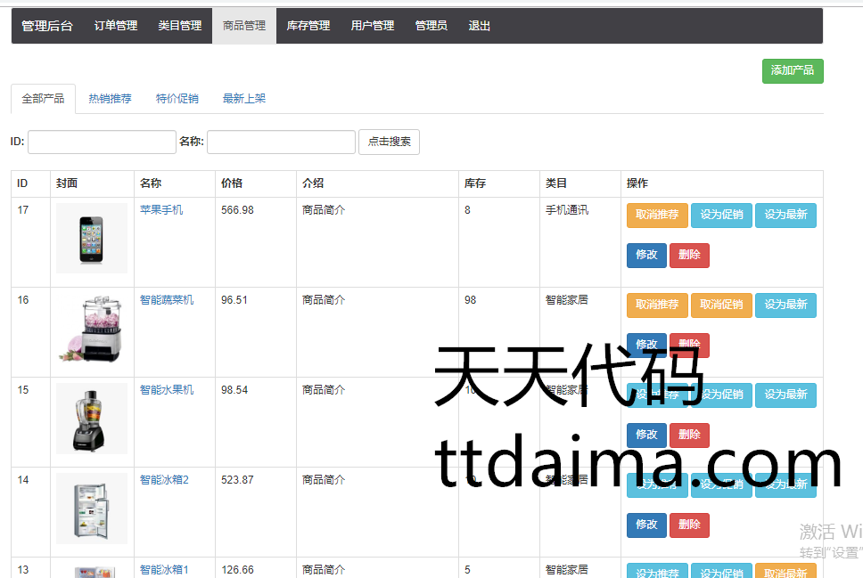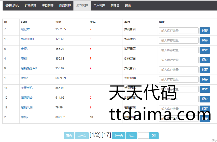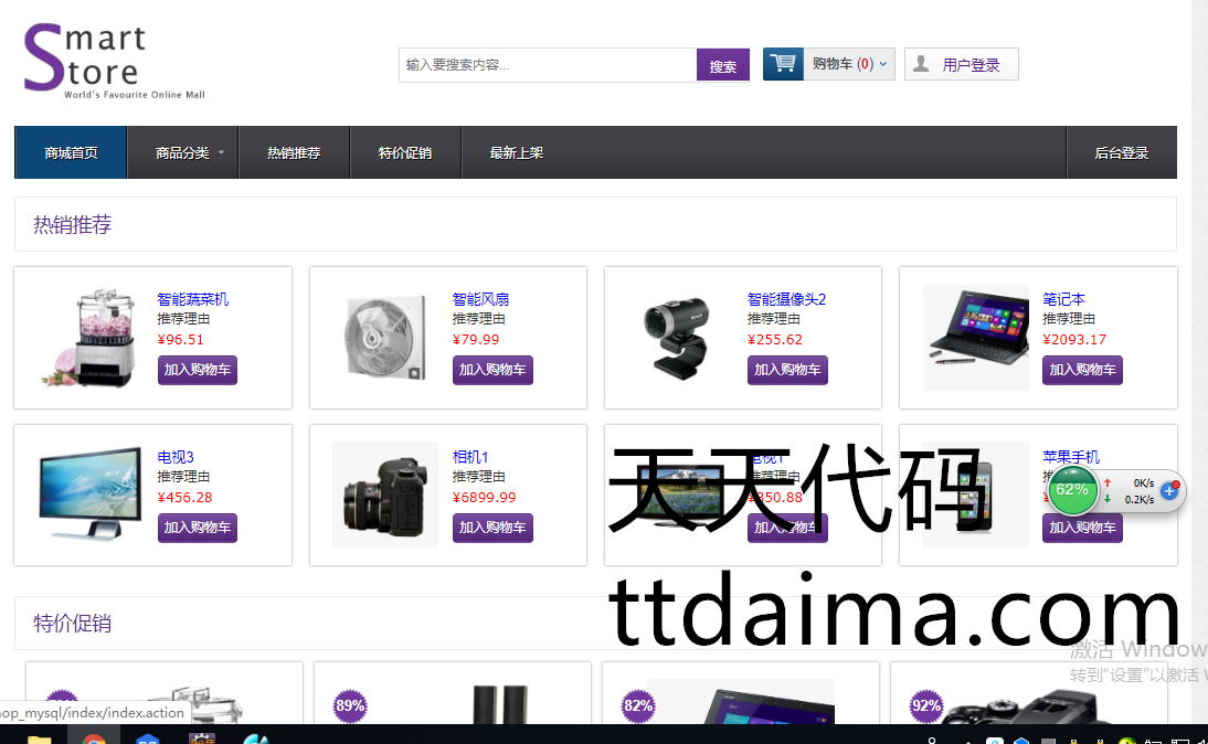 实现了如下功能:用户前台注册,登陆,查看最新商品,查看促销商品,查看热销商品,分类查看商品,并可以搜索商品,具有购物车功能,可以加入购物车,在线提交订单购买商品,查看个人订单,等功能。后台管理员实现了,用户管理,商品管理,分类管理,订单管理,库存管理,等功能。