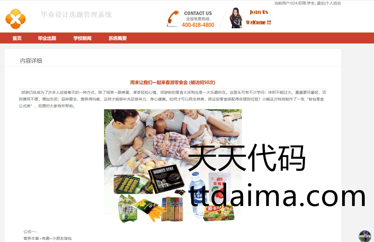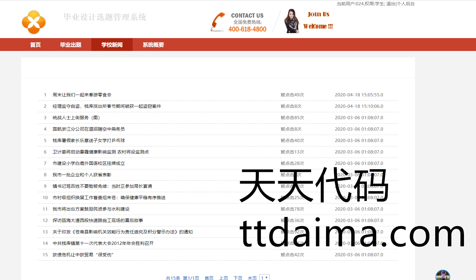 实现了如下功能:用户在前台可以进行,注册,登陆,查看学校新闻,查看毕业选题,并选择自己想要完成的题目,等功能。管理员后台可以进行,学生管理,教师管理,毕业出题管理,学生选题管理,新闻管理,等功能。