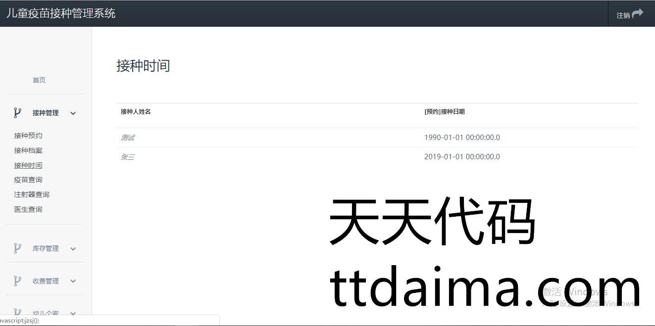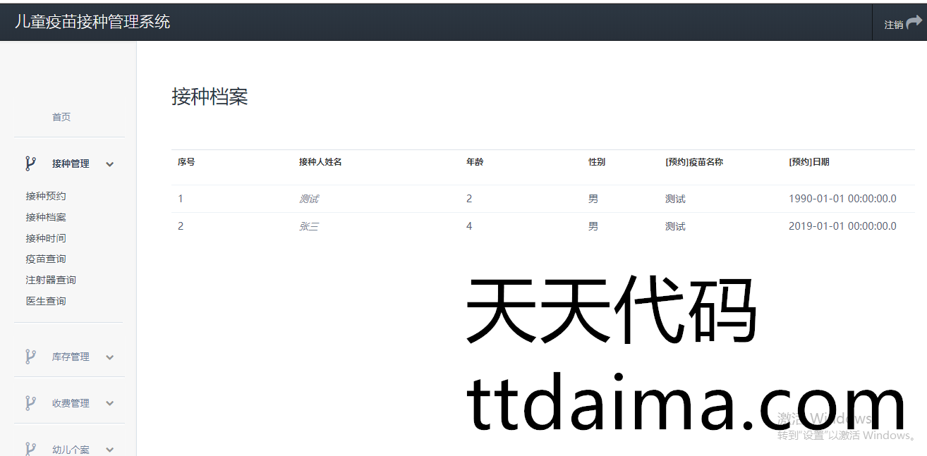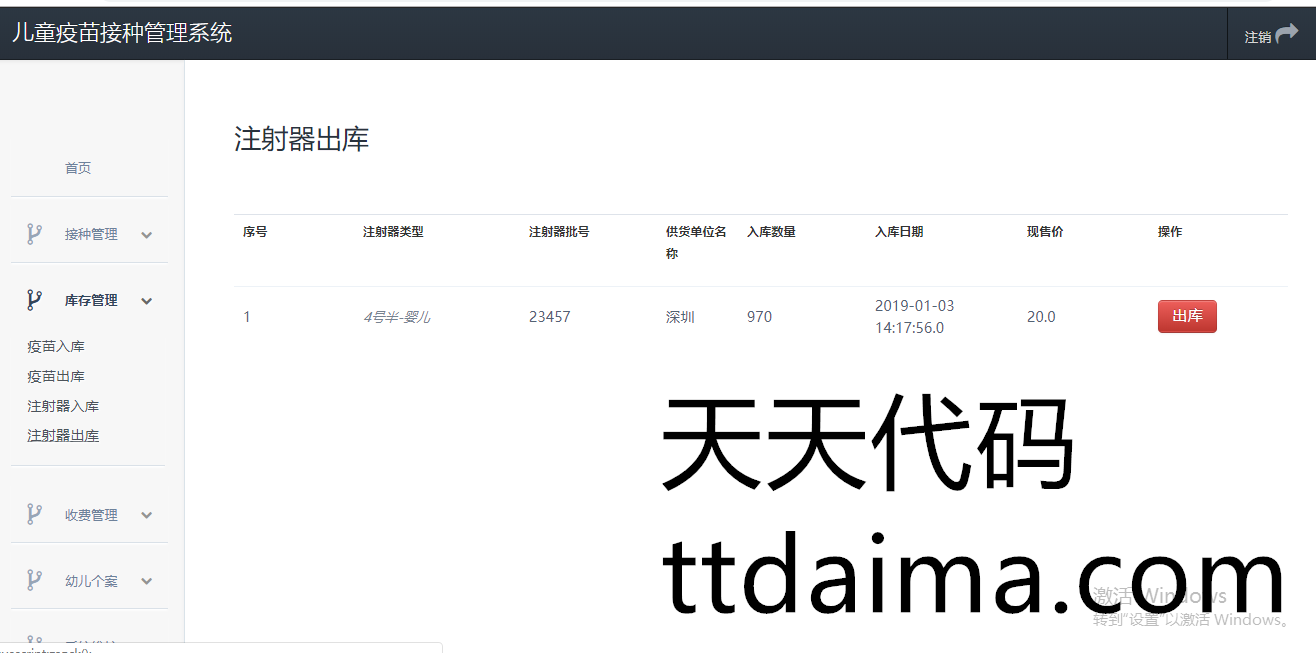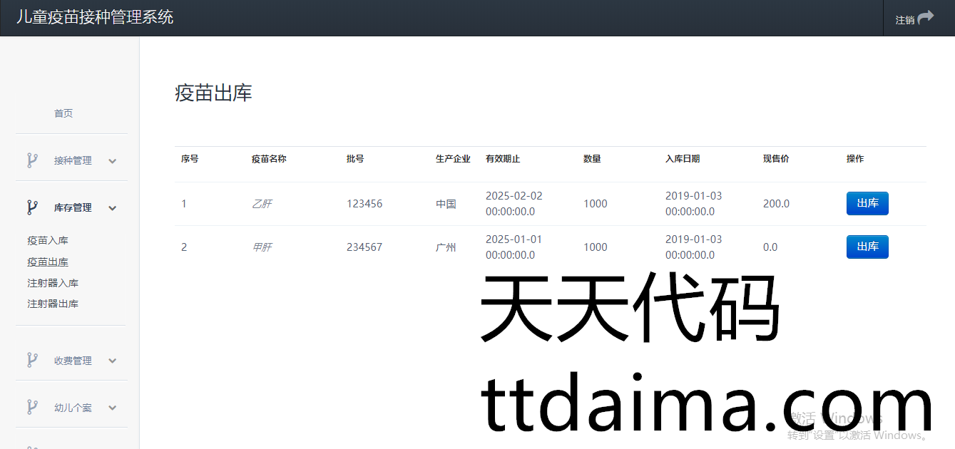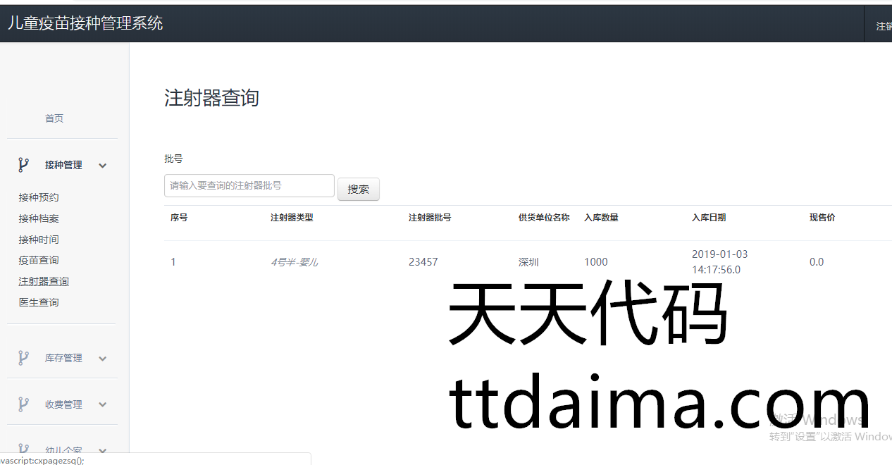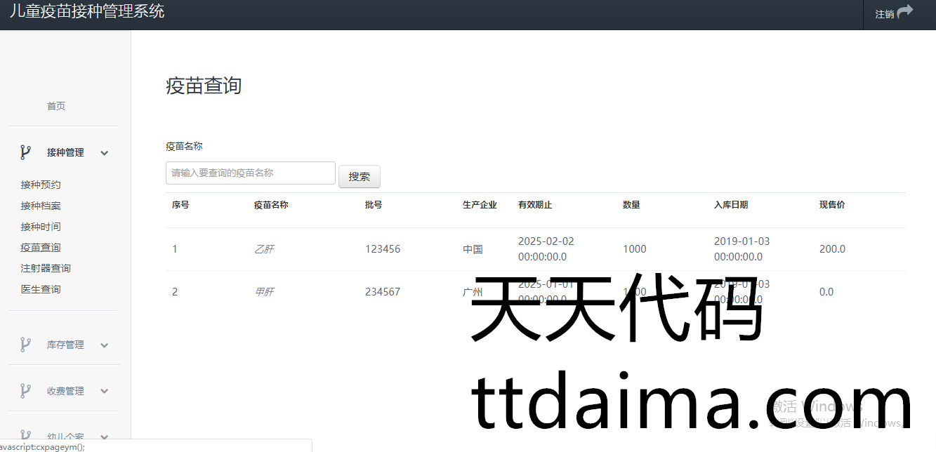 实现了如下功能:该系统提供了,接种管理,库存管理,收费管理,疫苗入库,疫苗出库,用户管理等功能。