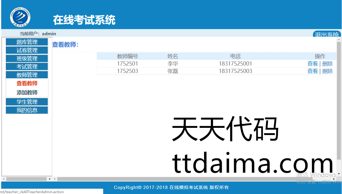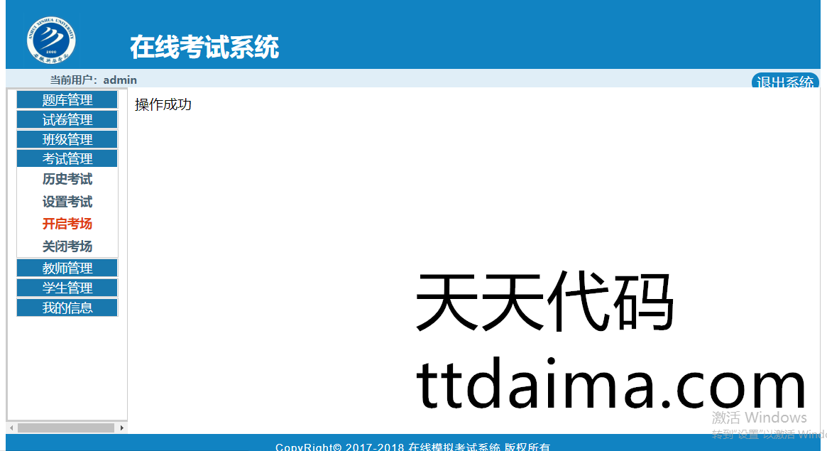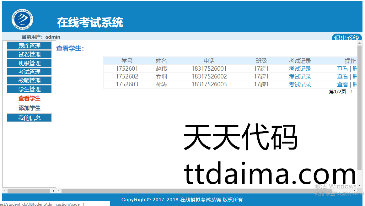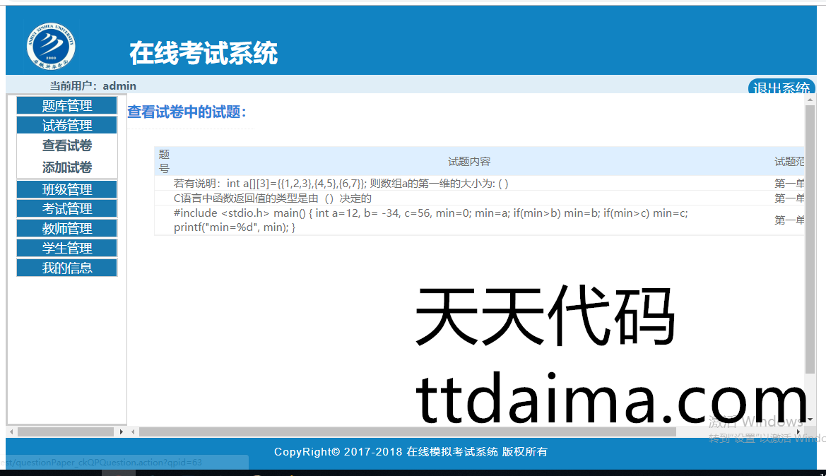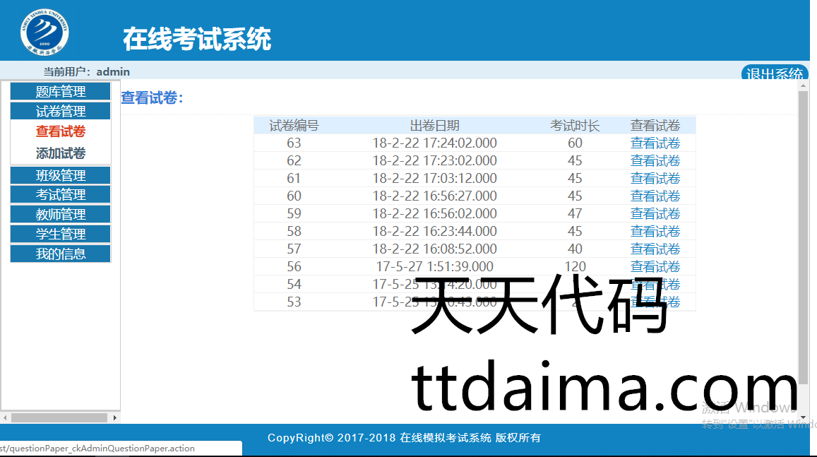 实现了如下功能:学生注册,登陆,在线考试,提交试卷,查看成绩,等功能。管理员具有题库管理,试卷管理,班级管理,考试管理,教师管理,学生管理,等功能。