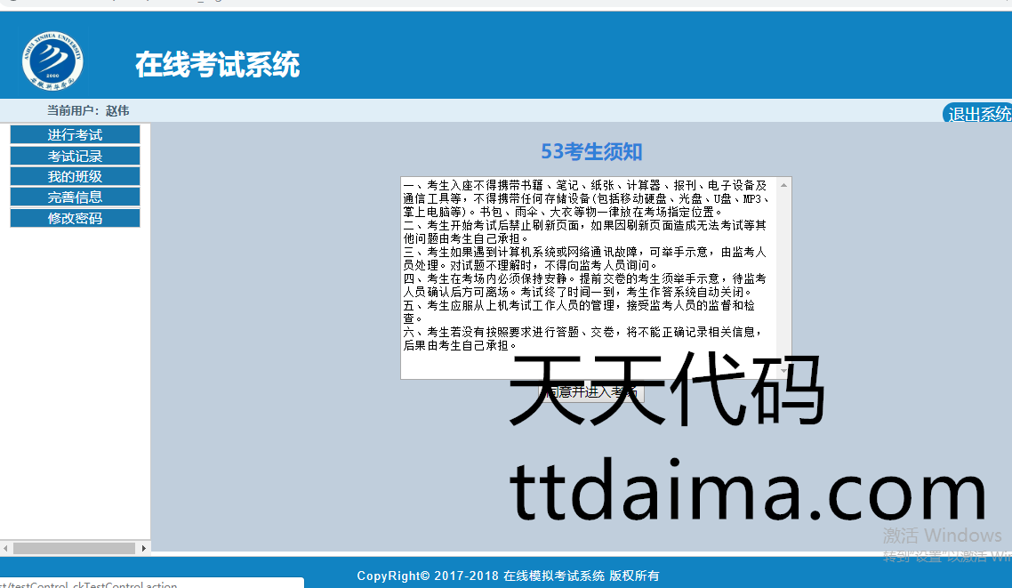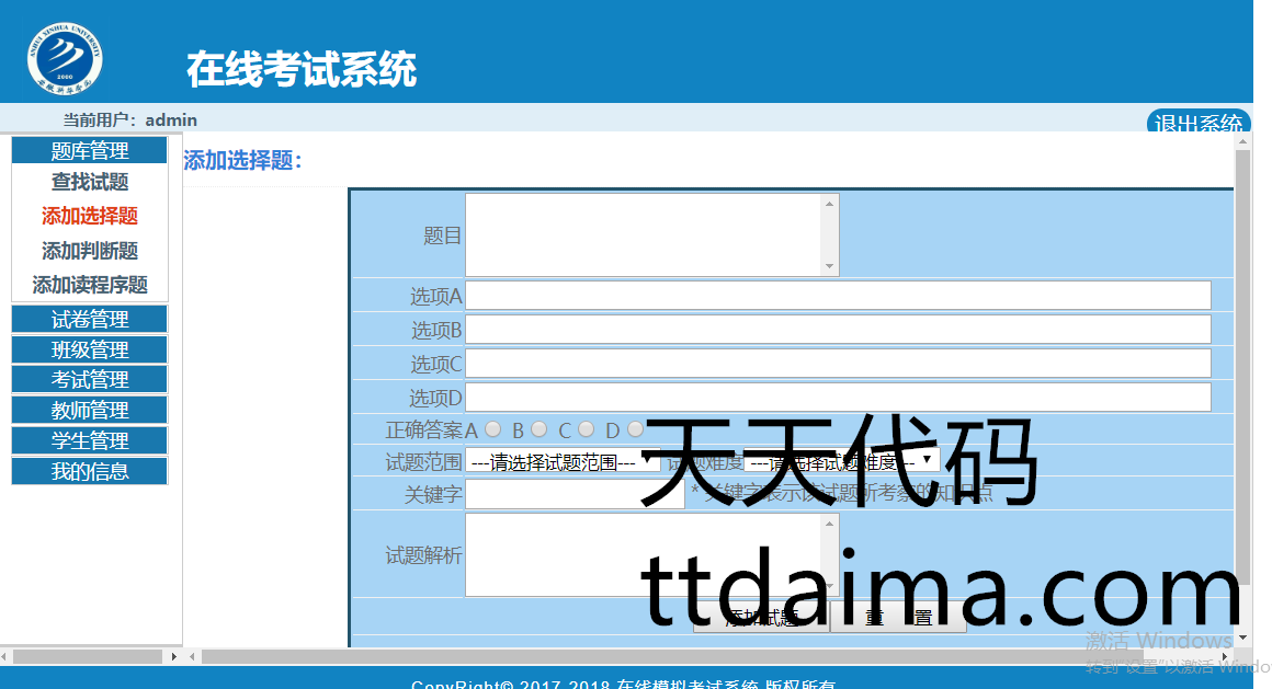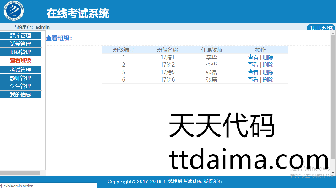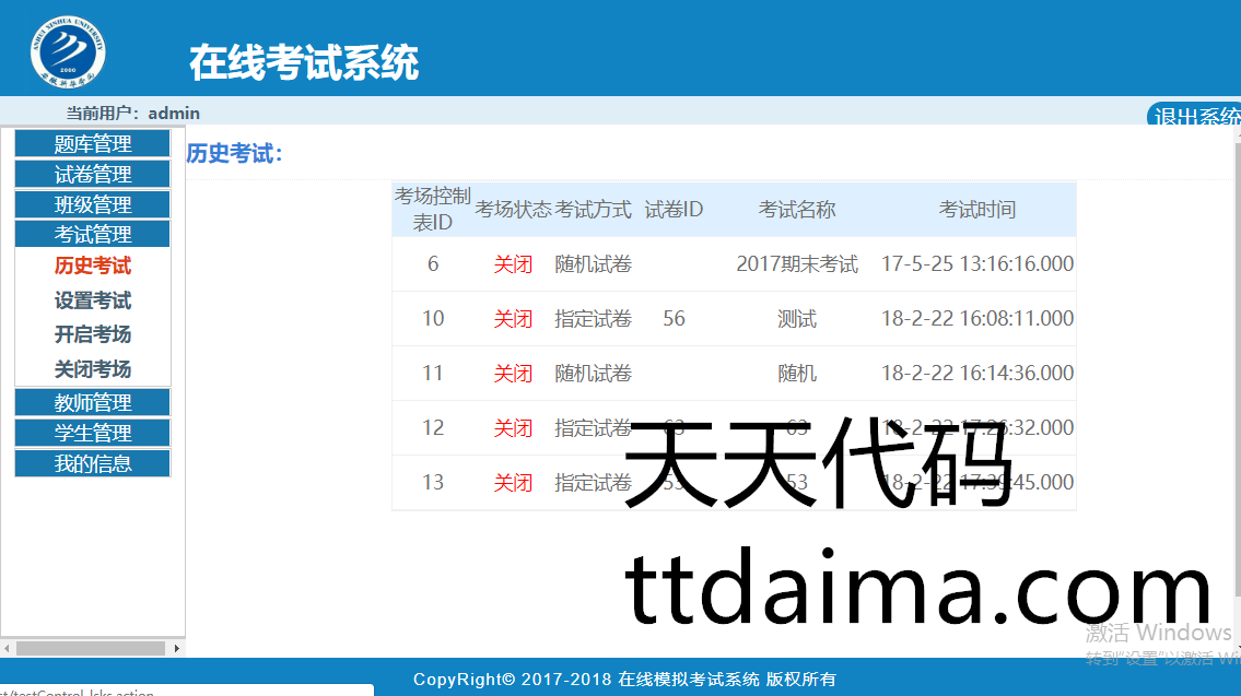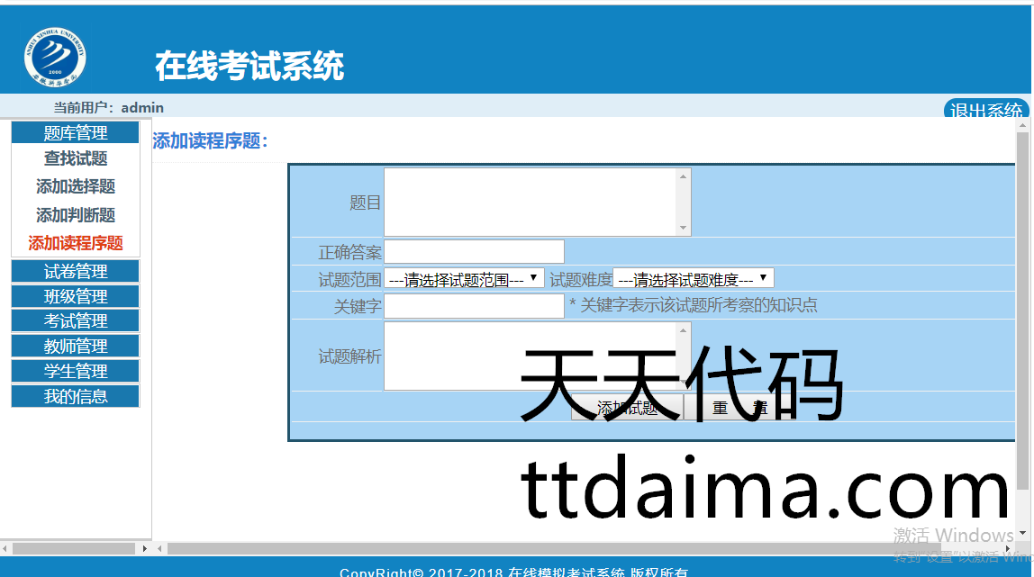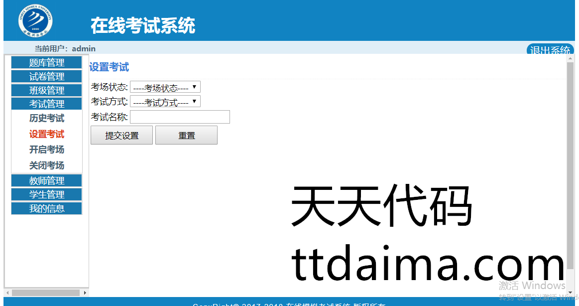 实现了如下功能:学生注册,登陆,在线考试,提交试卷,查看成绩,等功能。管理员具有题库管理,试卷管理,班级管理,考试管理,教师管理,学生管理,等功能。