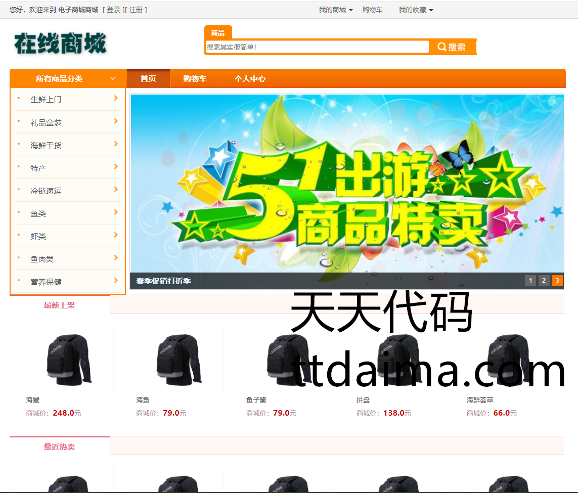 实现了如下功能:用户前台注册,登陆,搜索商品,分类查看商品,购物车,在线下单,购物,等功能。后台管理员提供了,用户管理,商品管理,商品分类管理,评论管理,客户管理,订单管理,统计报表,等功能。