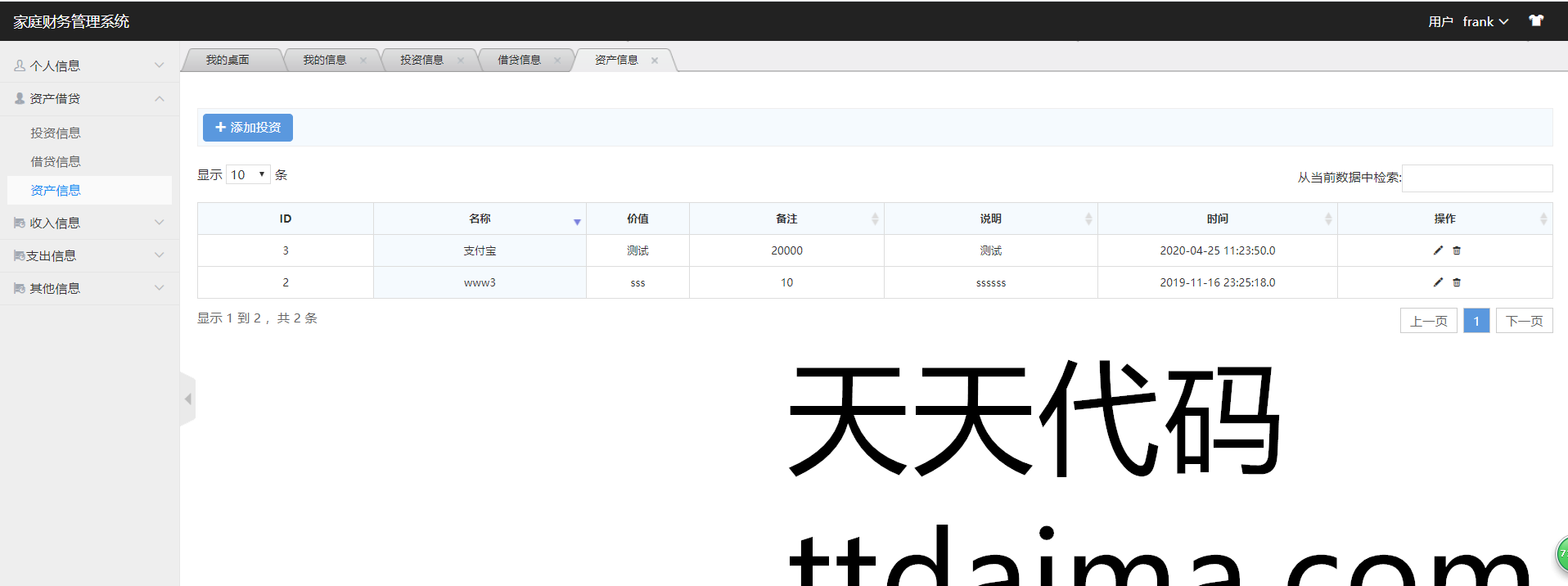 实现了如下功能:该系统可以进行,资产信息管理,支出信息管理,收入信息管理,家庭成员信息管理,等功能。