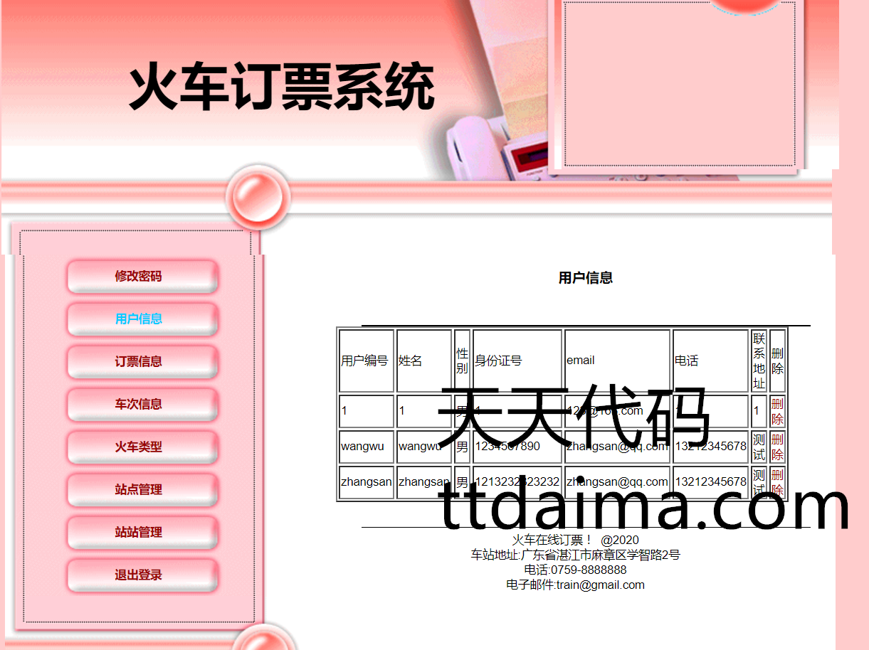 实现了如下功能:用户前台注册,登陆,按照站点查询火车,按地点,按车次查询,并可以进行在线订票,查看订票信息,等功能。后台管理员可以进行,用户信息管理,订票信息管理,车次信息管理,火车类型管理,站点信息管理,等功能。