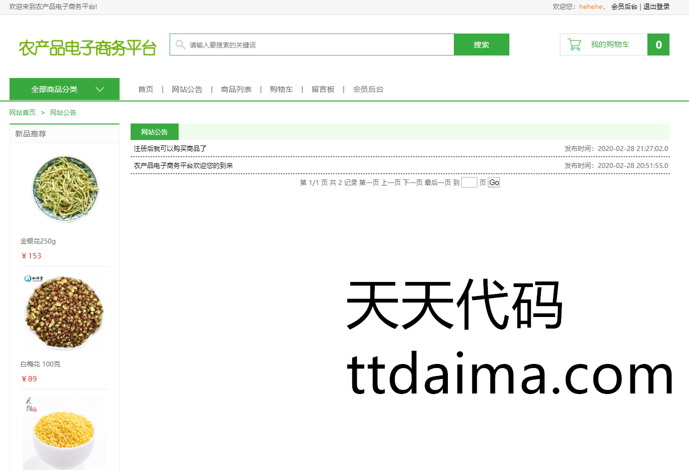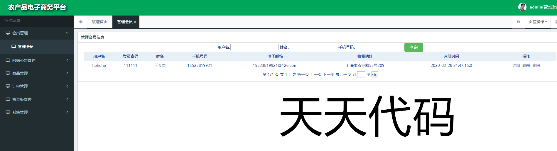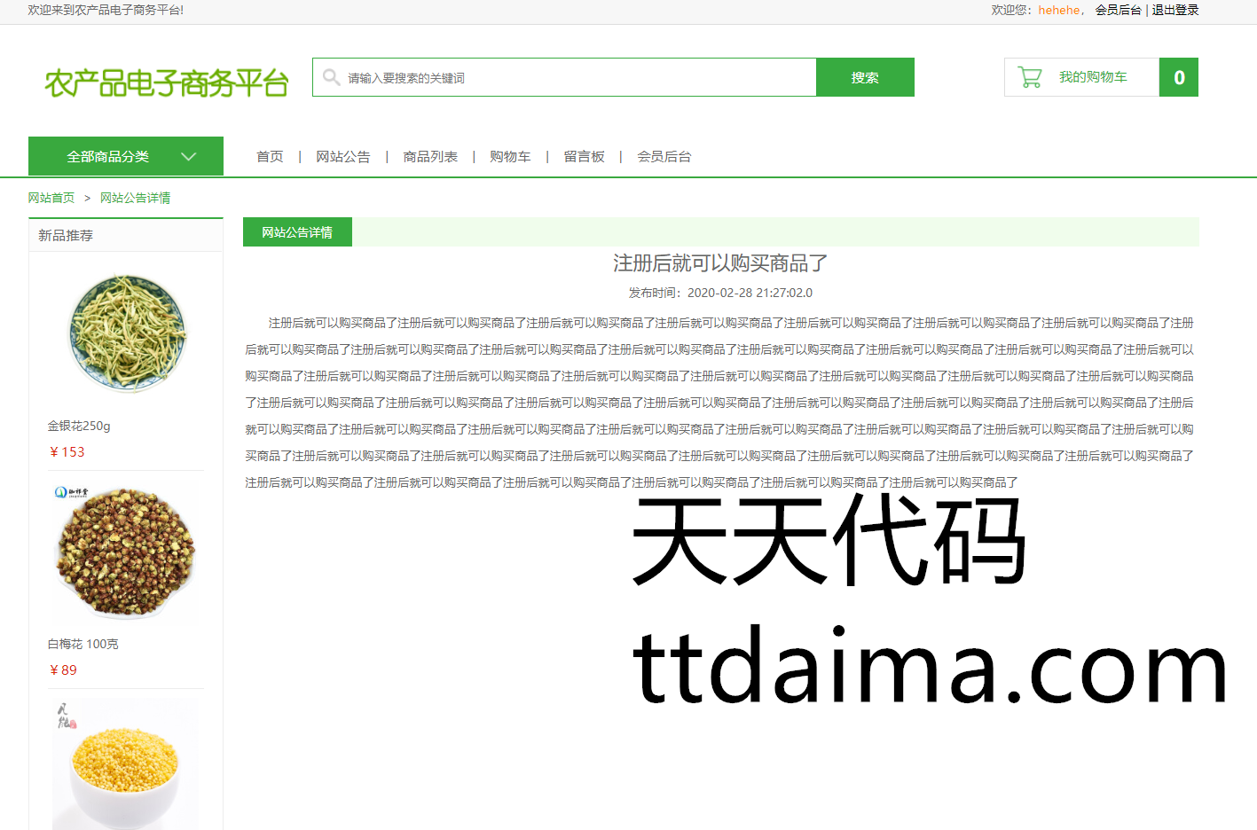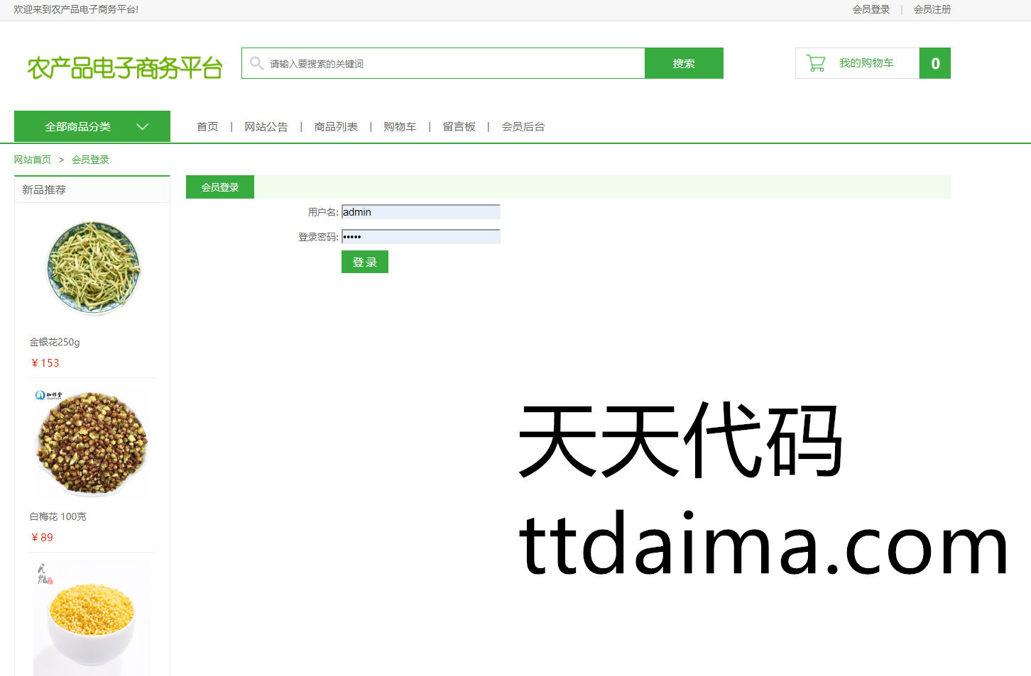 实现了如下功能:用户前台注册,登陆,搜索农产品,分类查看农产品,并具有购物车功能,可以在线下单购物,管理员后台可以进行,会员管理,商品管理,订单管理,公告管理,留言管理,等功能。