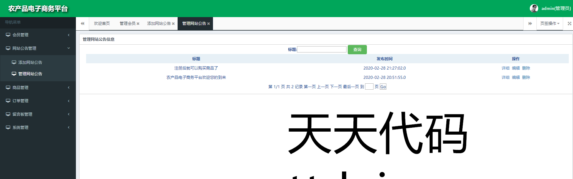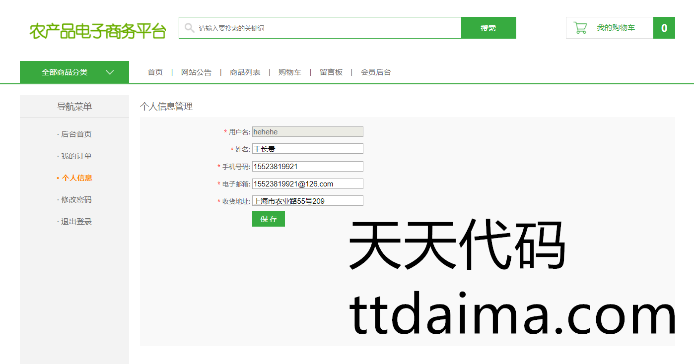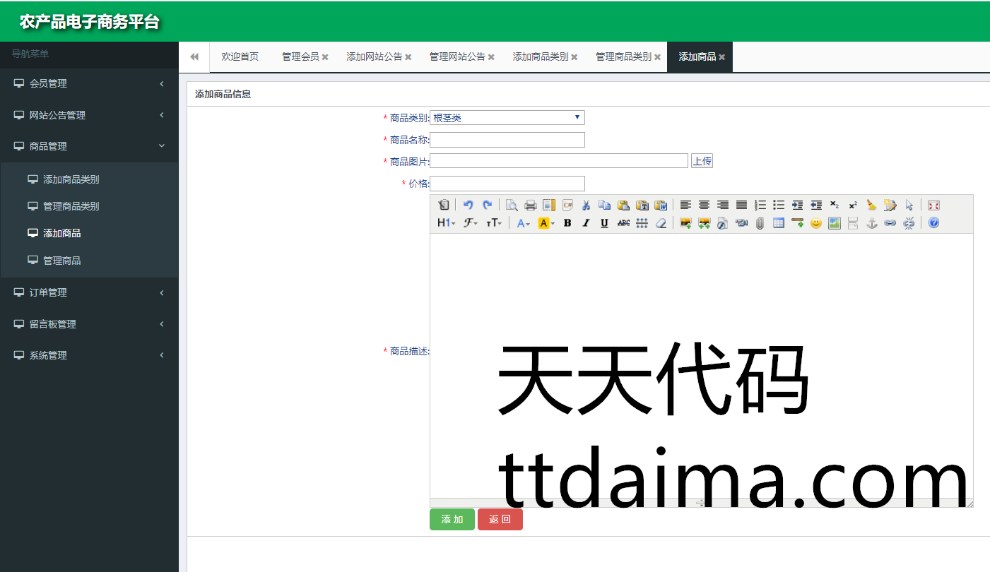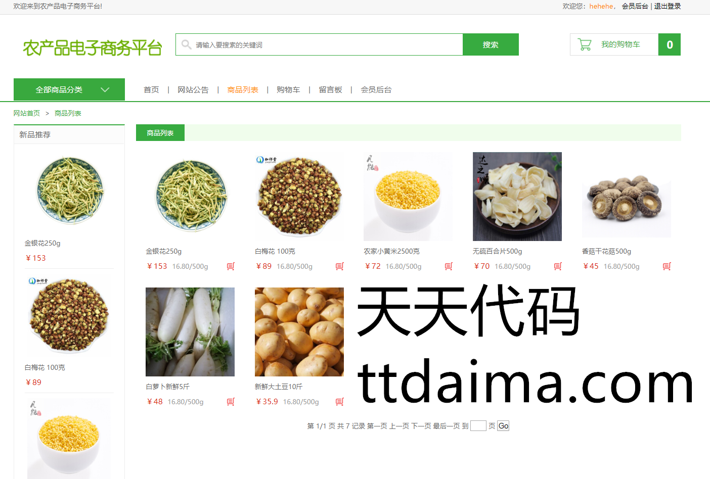实现了如下功能:用户前台注册,登陆,搜索农产品,分类查看农产品,并具有购物车功能,可以在线下单购物,管理员后台可以进行,会员管理,商品管理,订单管理,公告管理,留言管理,等功能。