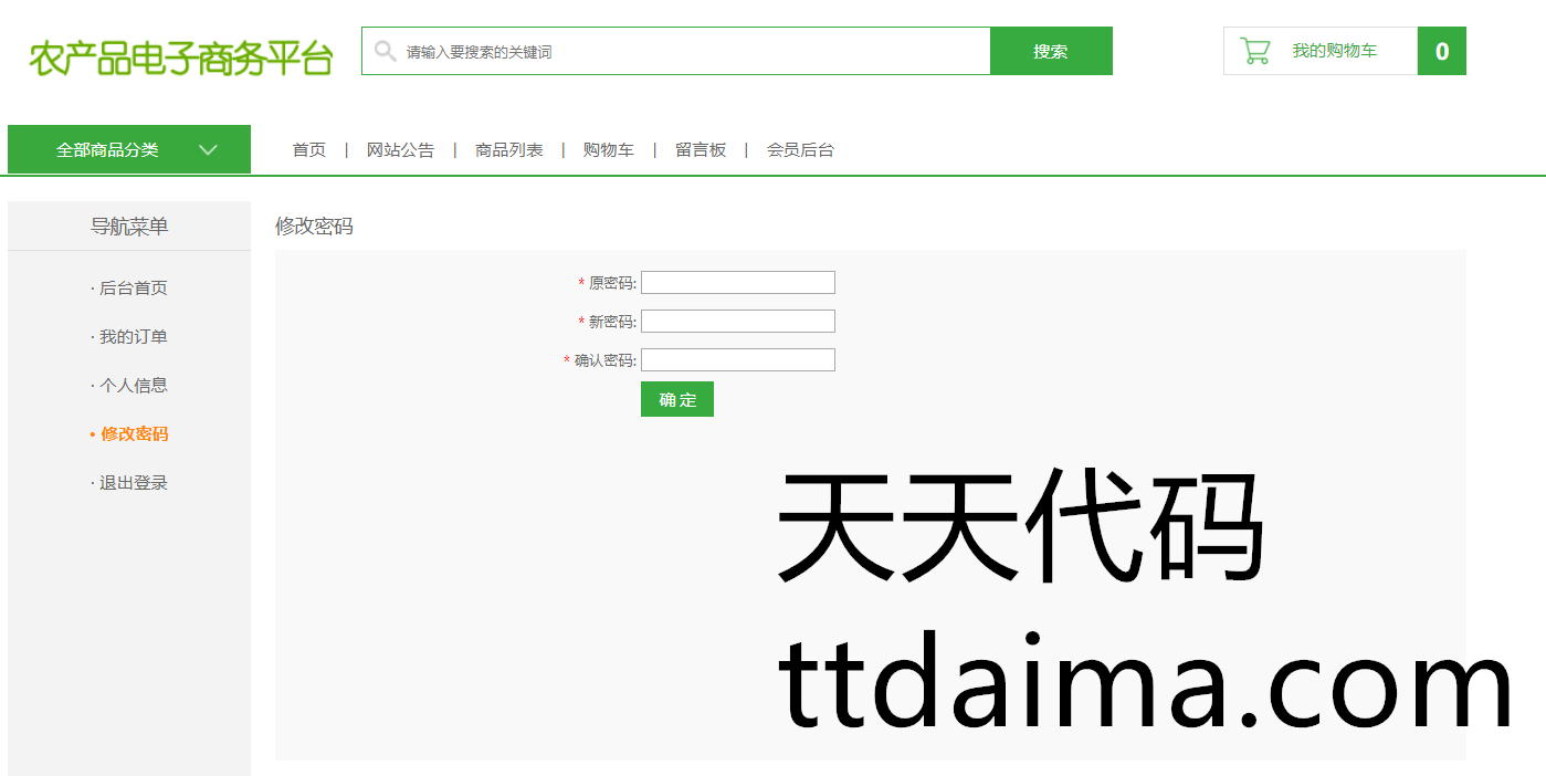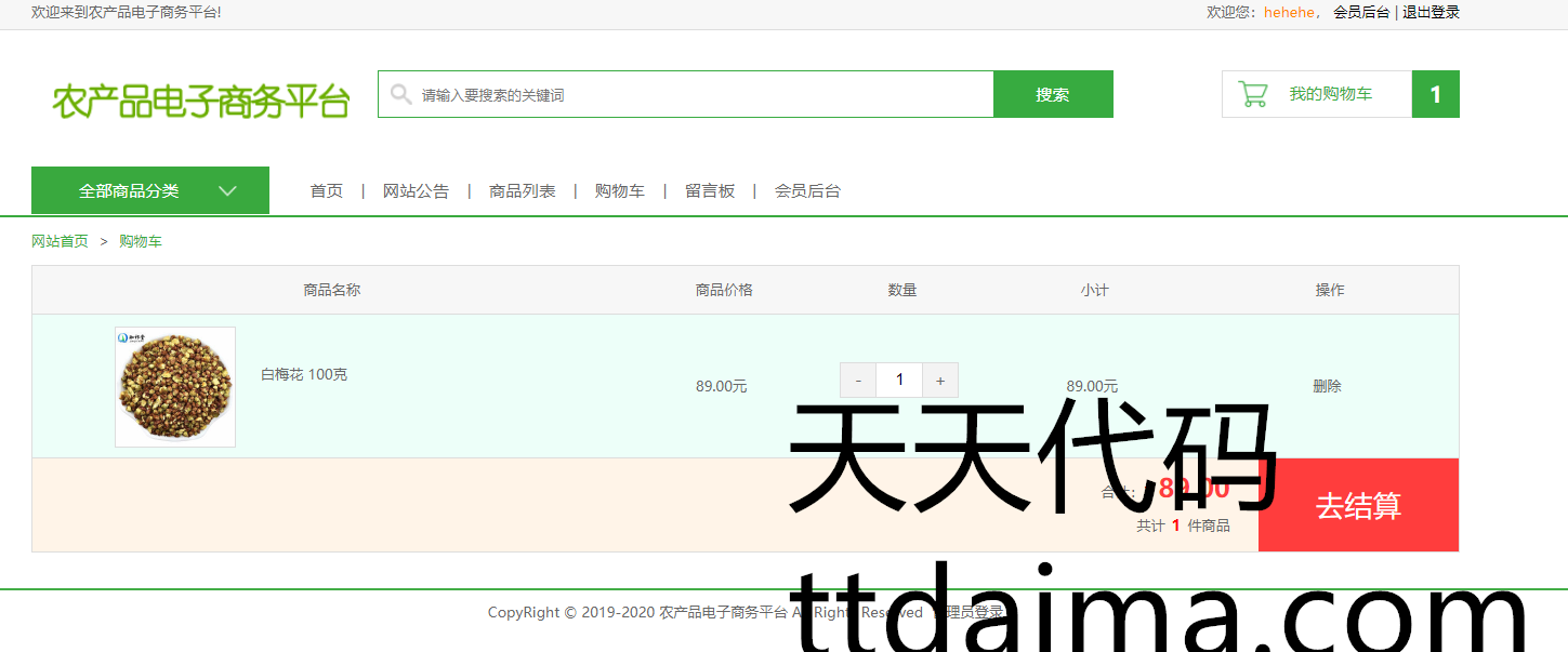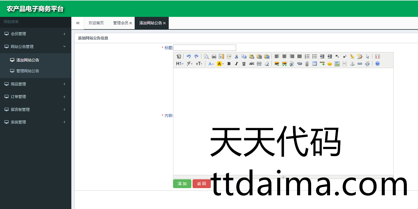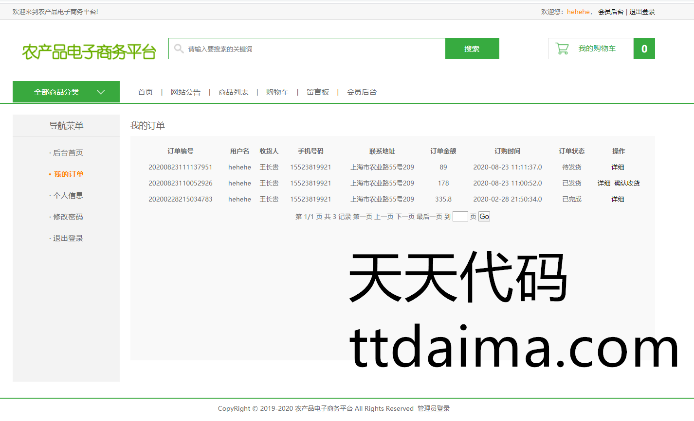 实现了如下功能:用户前台注册,登陆,搜索农产品,分类查看农产品,并具有购物车功能,可以在线下单购物,管理员后台可以进行,会员管理,商品管理,订单管理,公告管理,留言管理,等功能。