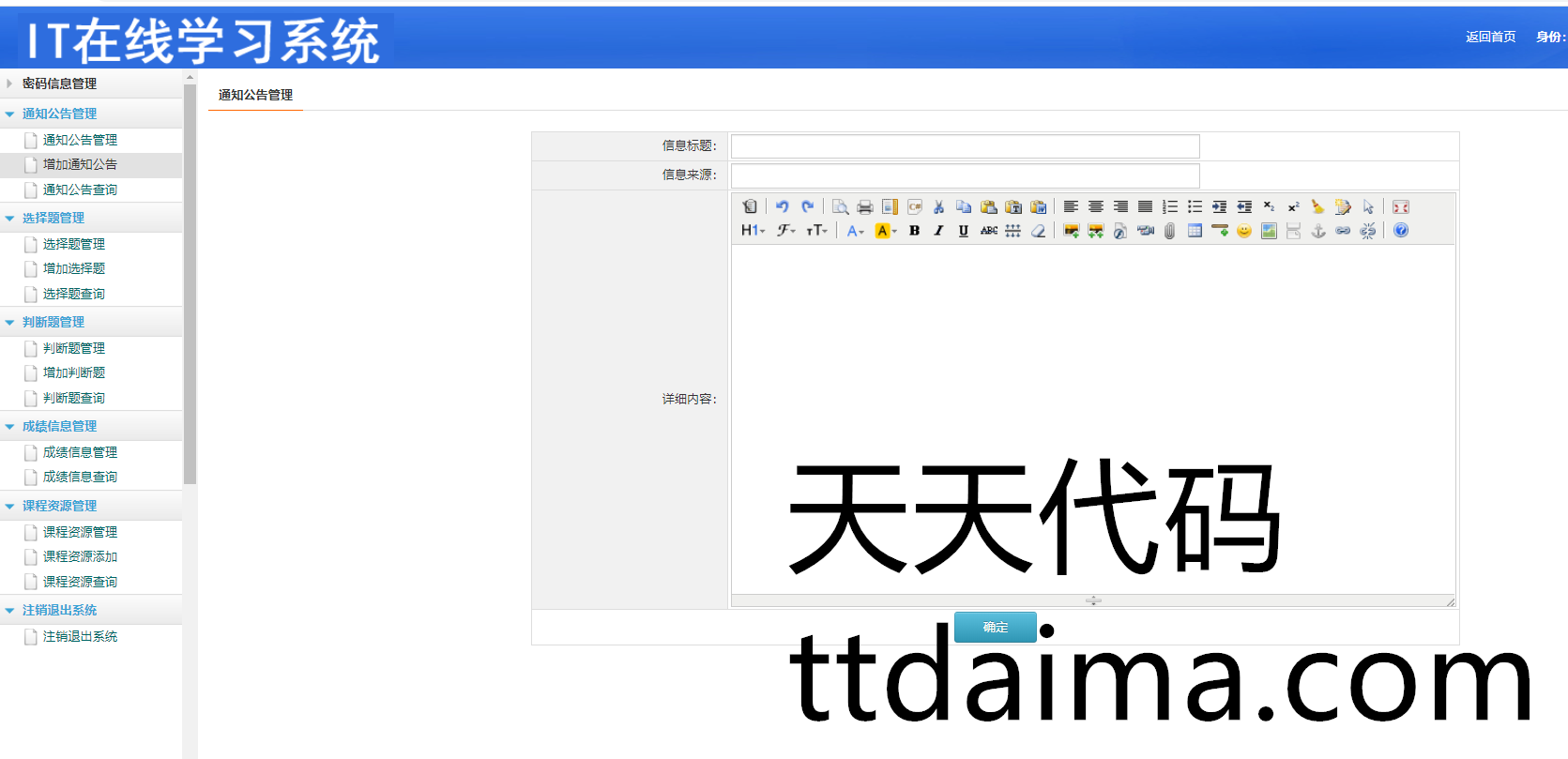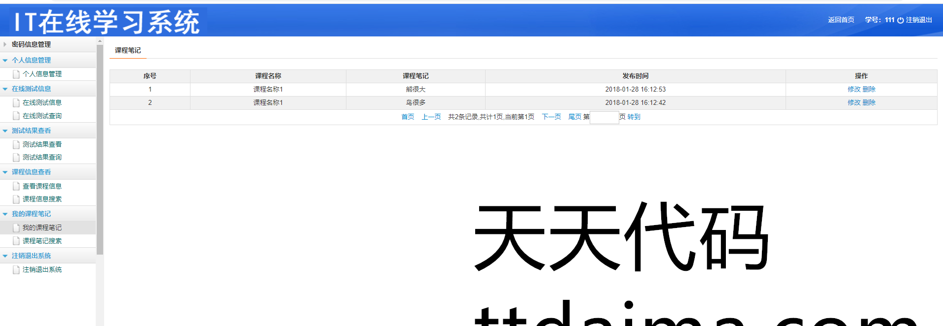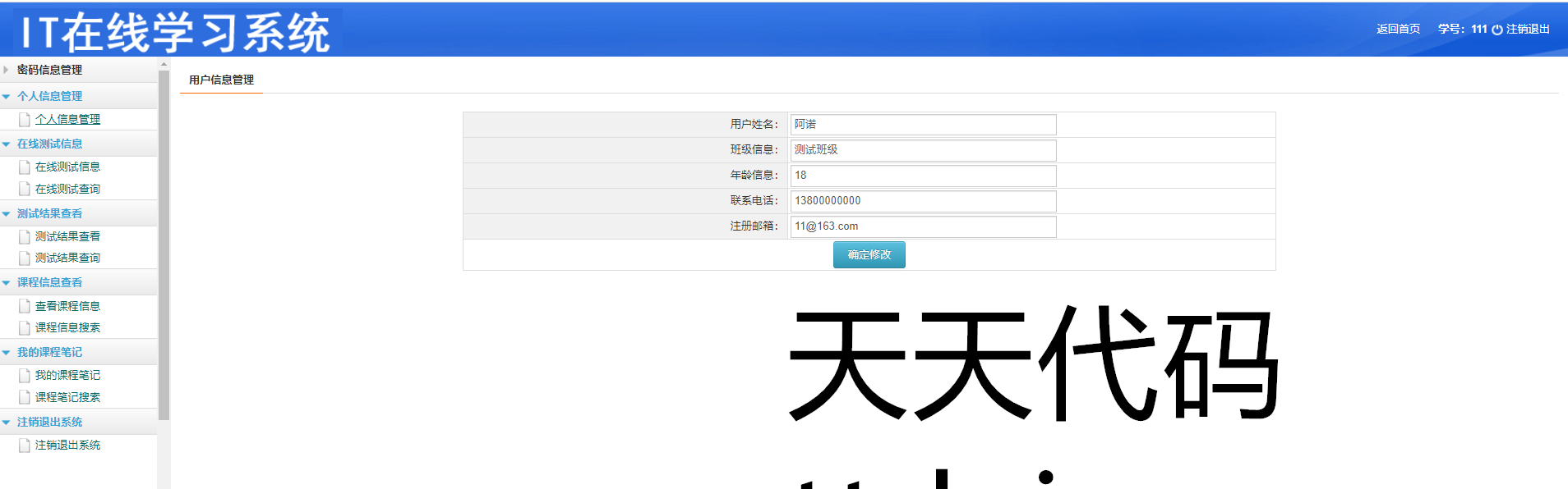 实现了如下功能:学生登陆系统,可以进行在线学习,测试,测试结果查看,个人笔记查看,查看通知信息,等功能。后台管理员可以进行,题目信息管理,课程信息管理,成绩信息管理,等功能。