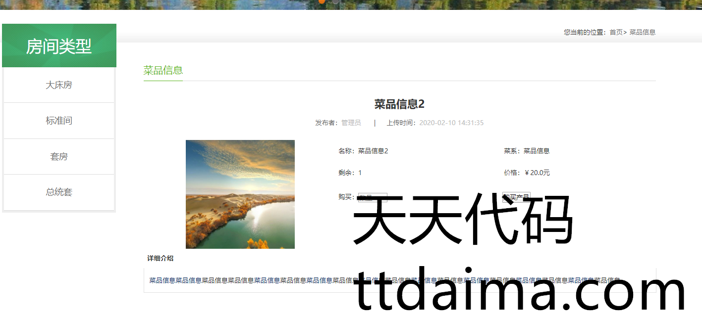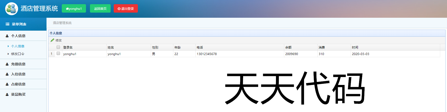 实现了如下功能:用户前台可以进行,登陆,注册,查看酒店房间信息,菜品信息,在线预定房间,等功能。管理员后台可以进行,会员信息管理,房间信息管理,充值信息管理,座位管理,菜品管理,等功能。