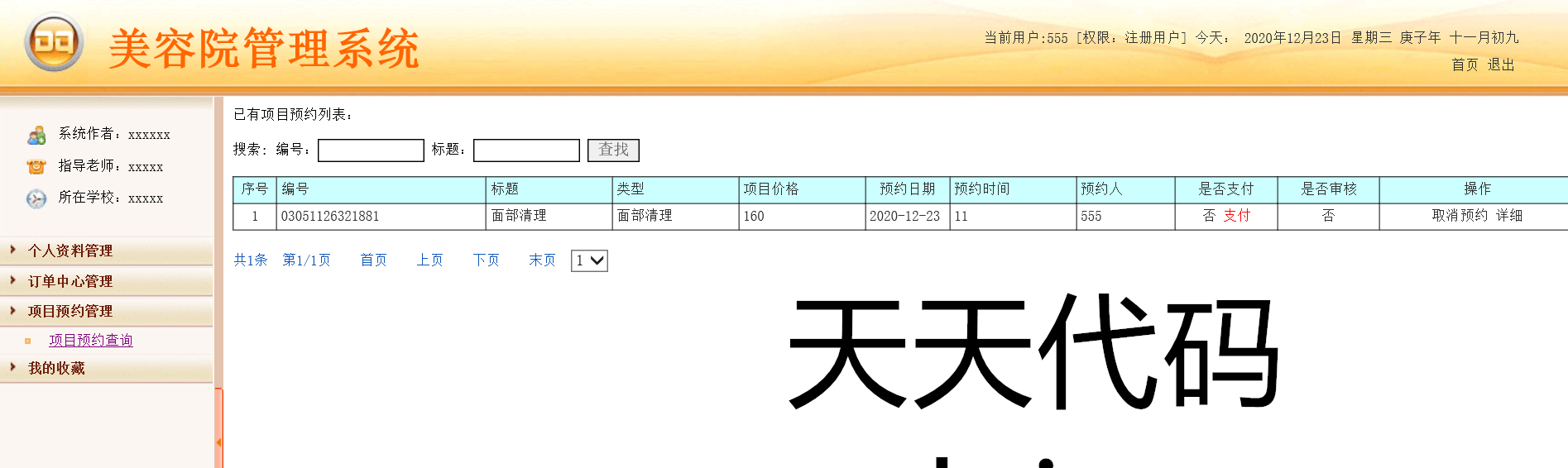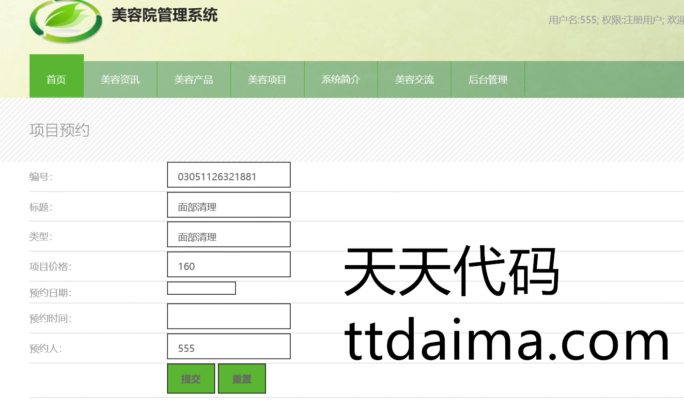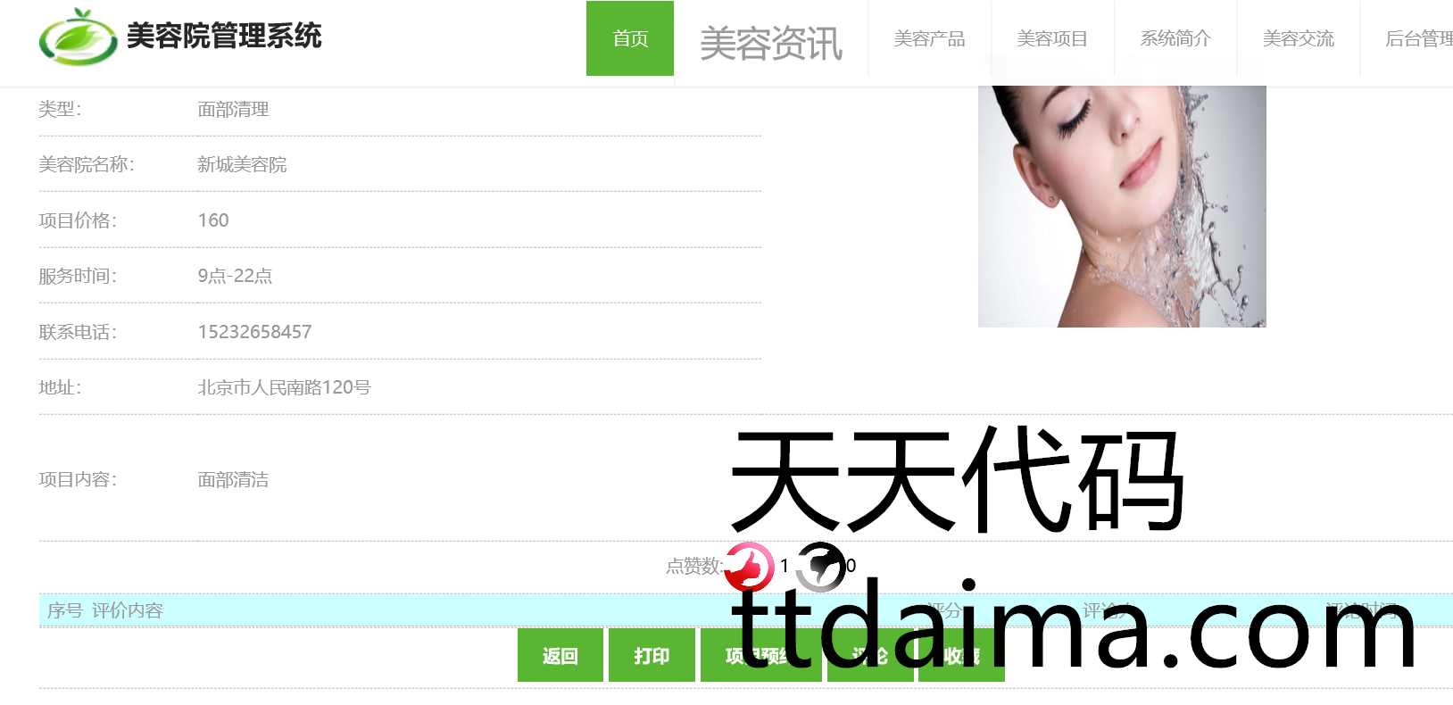 实现了如下功能:用户前台注册,登陆,美容资讯浏览,美容产品浏览,美容项目浏览,美容在线交流,等功能。用户登陆之后可以进行个人资料管理,订单管理,预约管理,收藏管理,等功能。管理员登录后可以进行,用户管理,资讯管理,预约管理,产品管理,项目管理,等功能。
