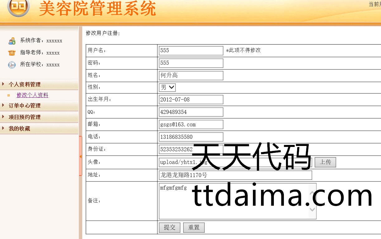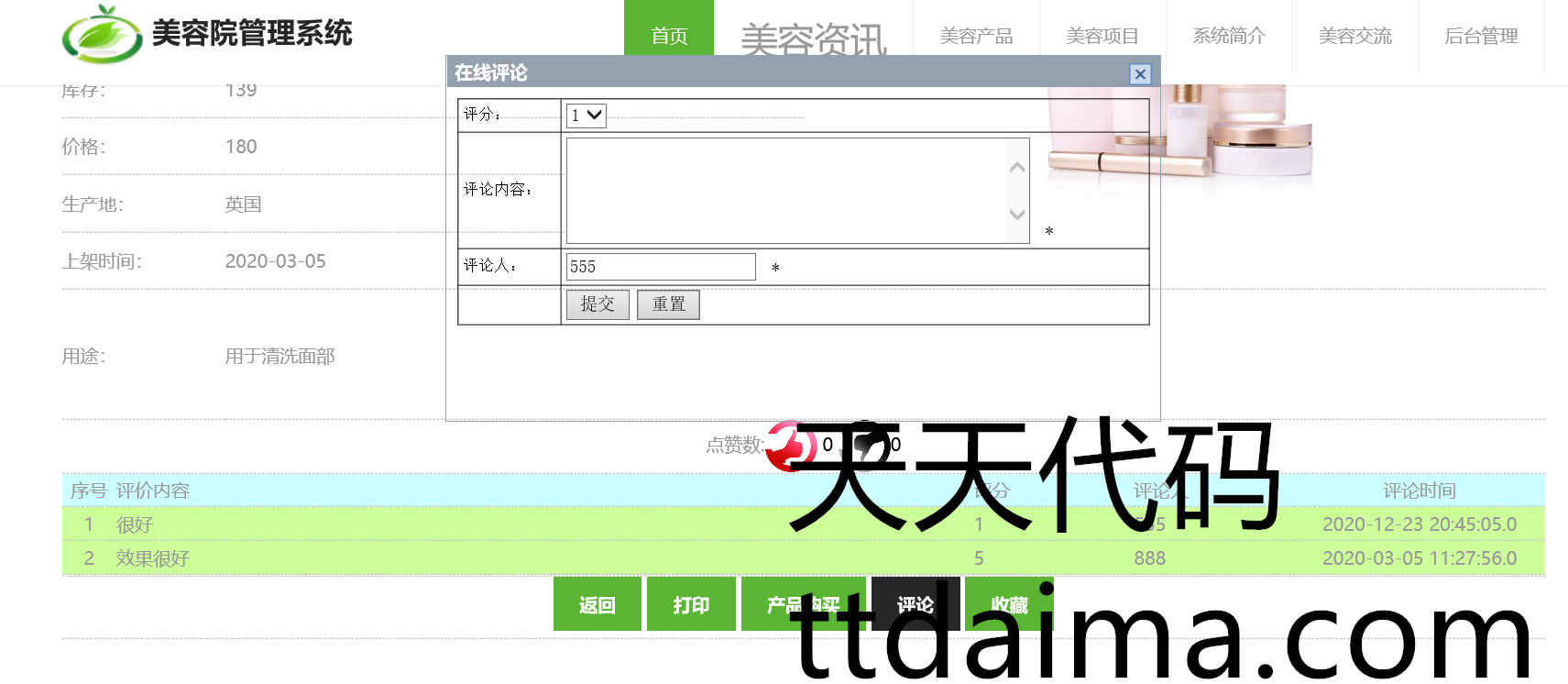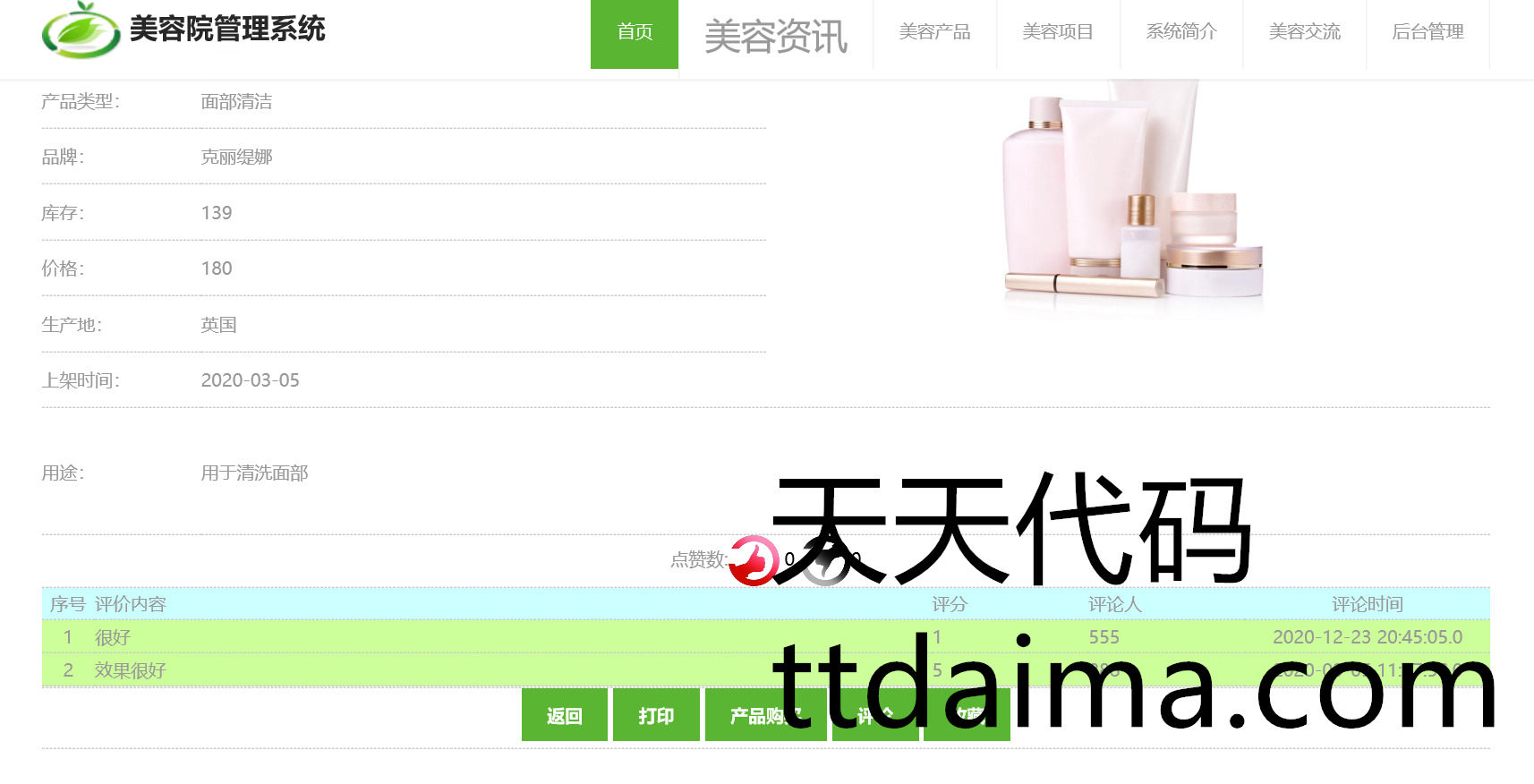实现了如下功能:用户前台注册,登陆,美容资讯浏览,美容产品浏览,美容项目浏览,美容在线交流,等功能。用户登陆之后可以进行个人资料管理,订单管理,预约管理,收藏管理,等功能。管理员登录后可以进行,用户管理,资讯管理,预约管理,产品管理,项目管理,等功能。