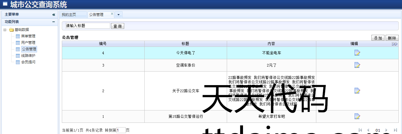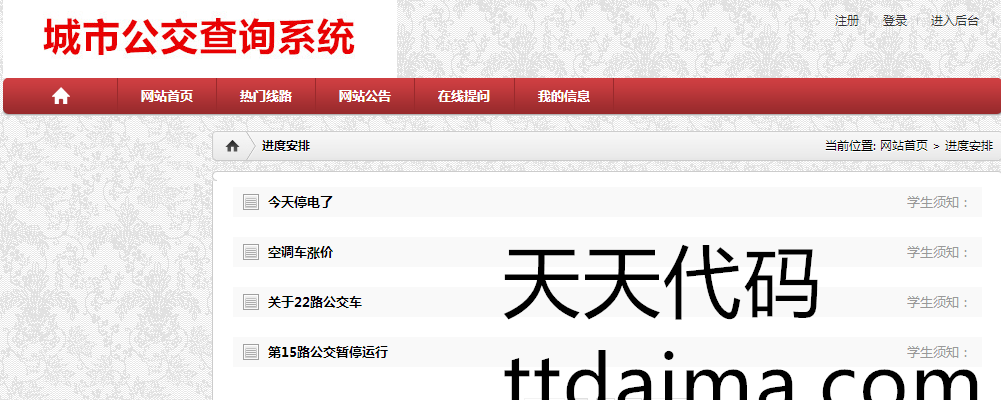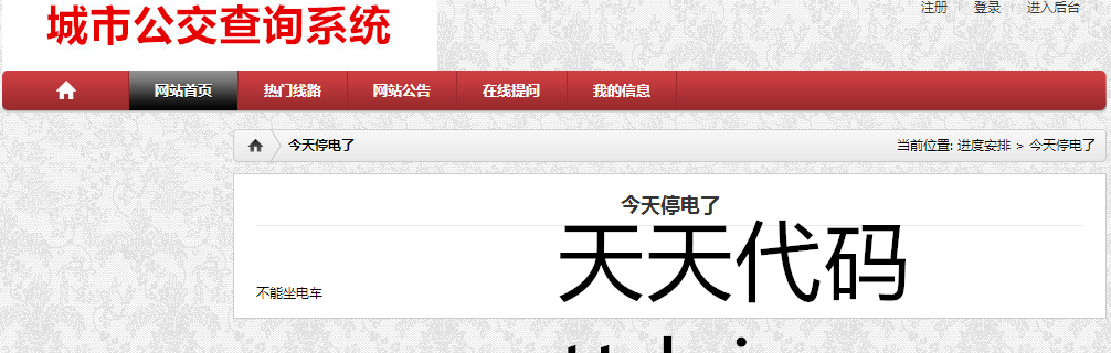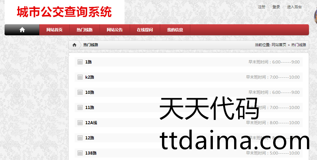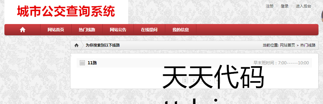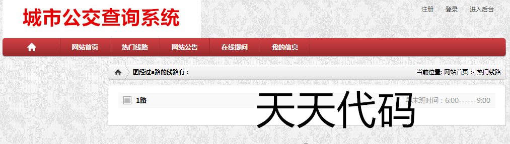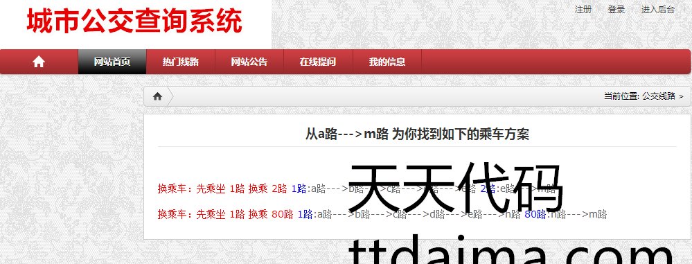 实现了如下功能:用户注册,登陆,公交换乘查询,公交线路查询,公交站点查询,等功能。后台管理员可以进行,用户管理,线路维护,公告管理,等功能。