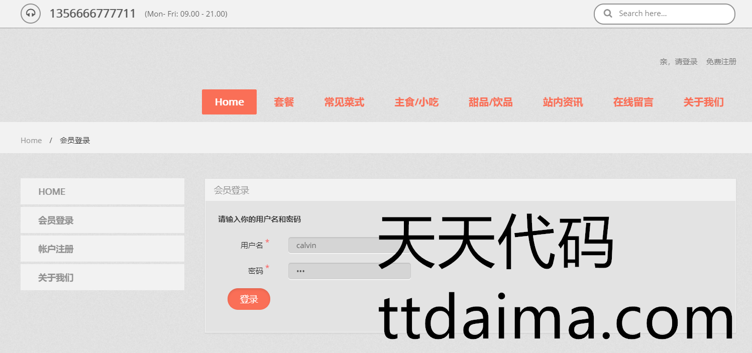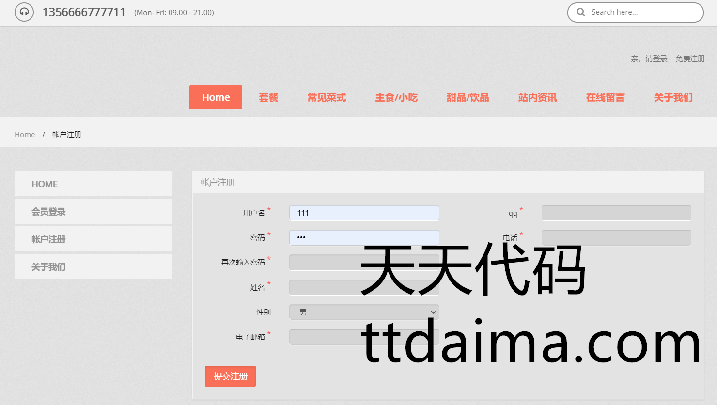实现了如下功能:户注册,登陆,查看套餐,查看常见菜式,查看主食小吃,查看甜品饮品,并可以在线点餐,查看网站资讯,在线留言等功能。后台管理员可以进行基础信息管理,业务信息管理,网站数据统计分析,等各项详细的管理,