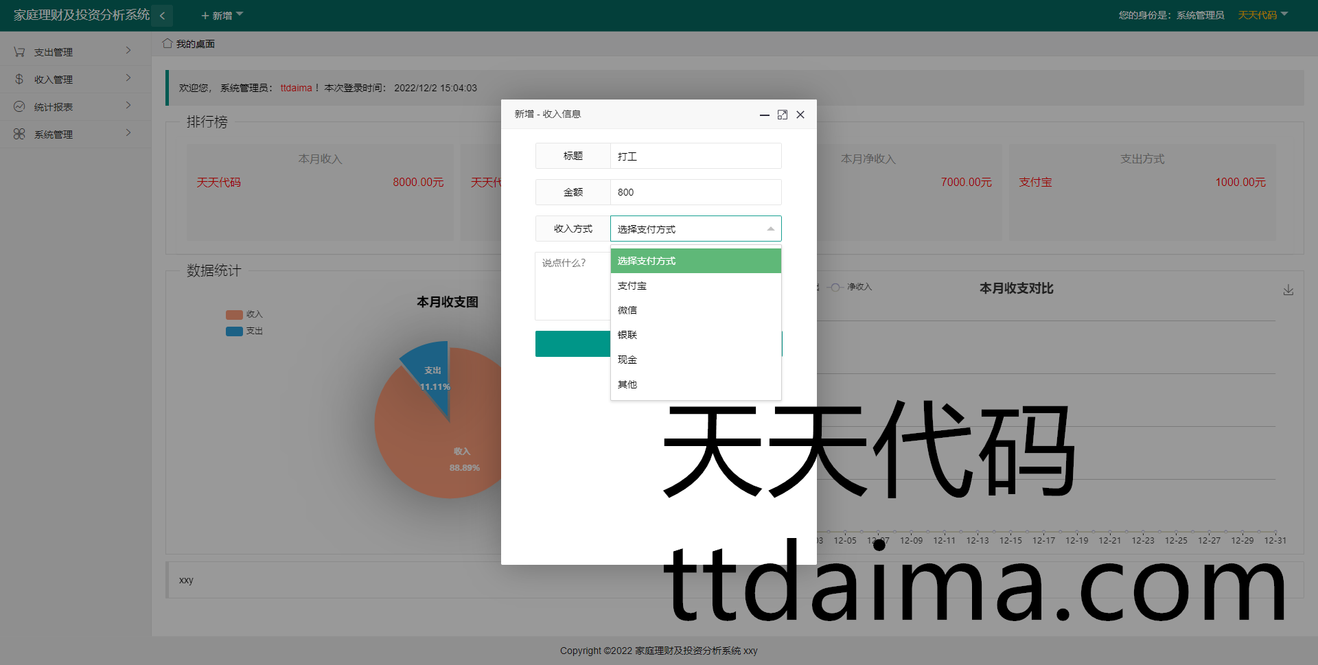 实现了如下功能:收入管理,支出管理,统计报表,用户管理,工作管理等功能。